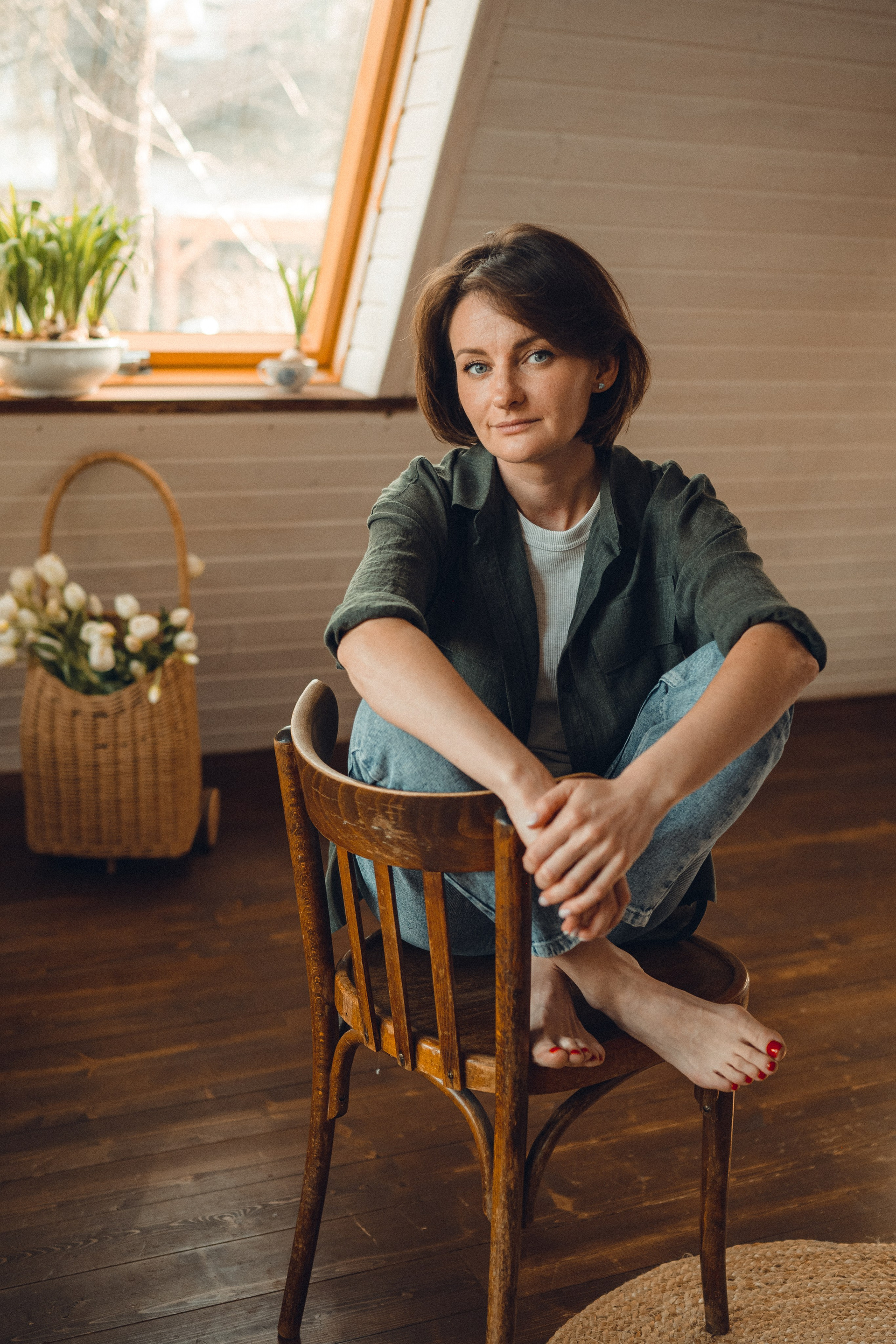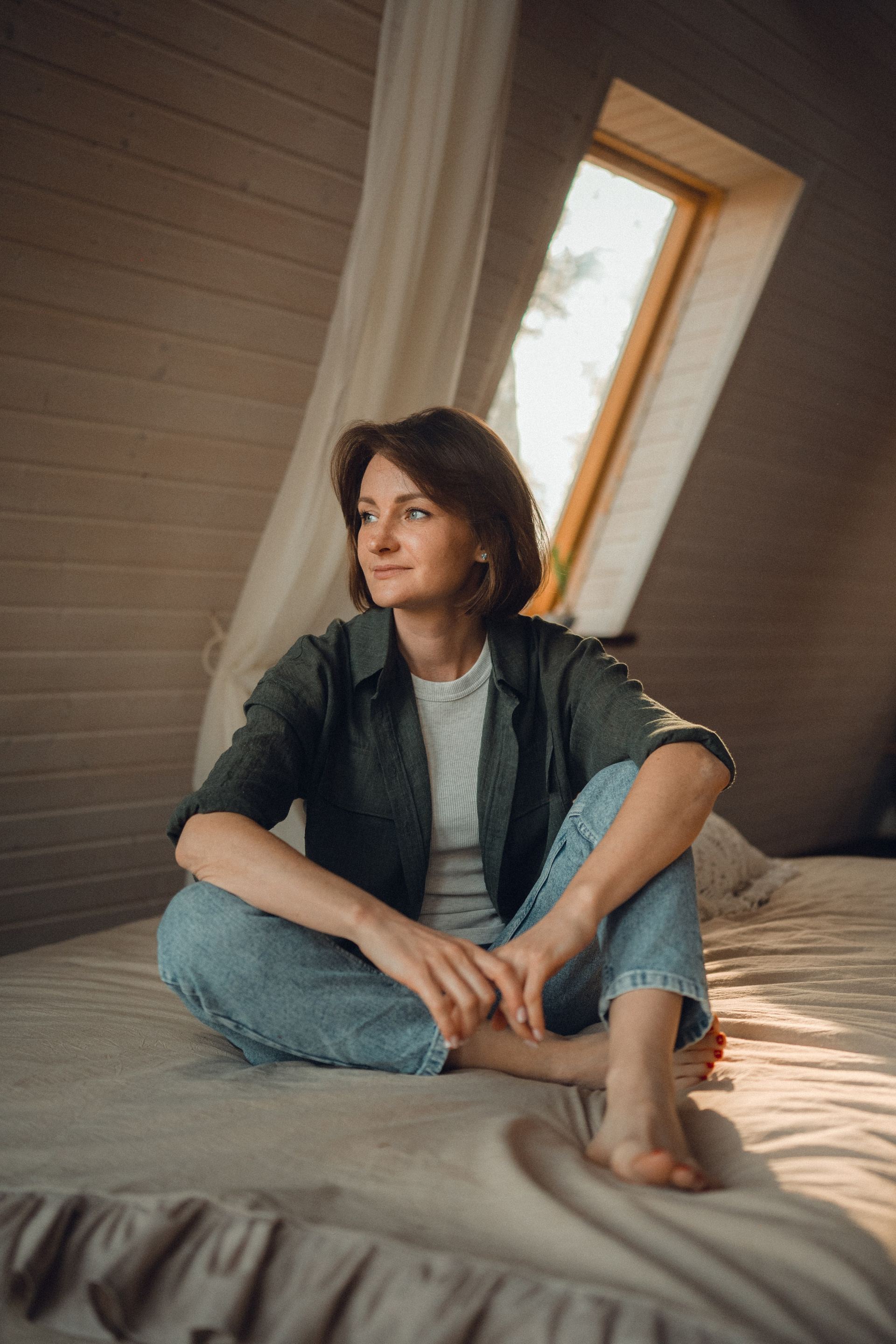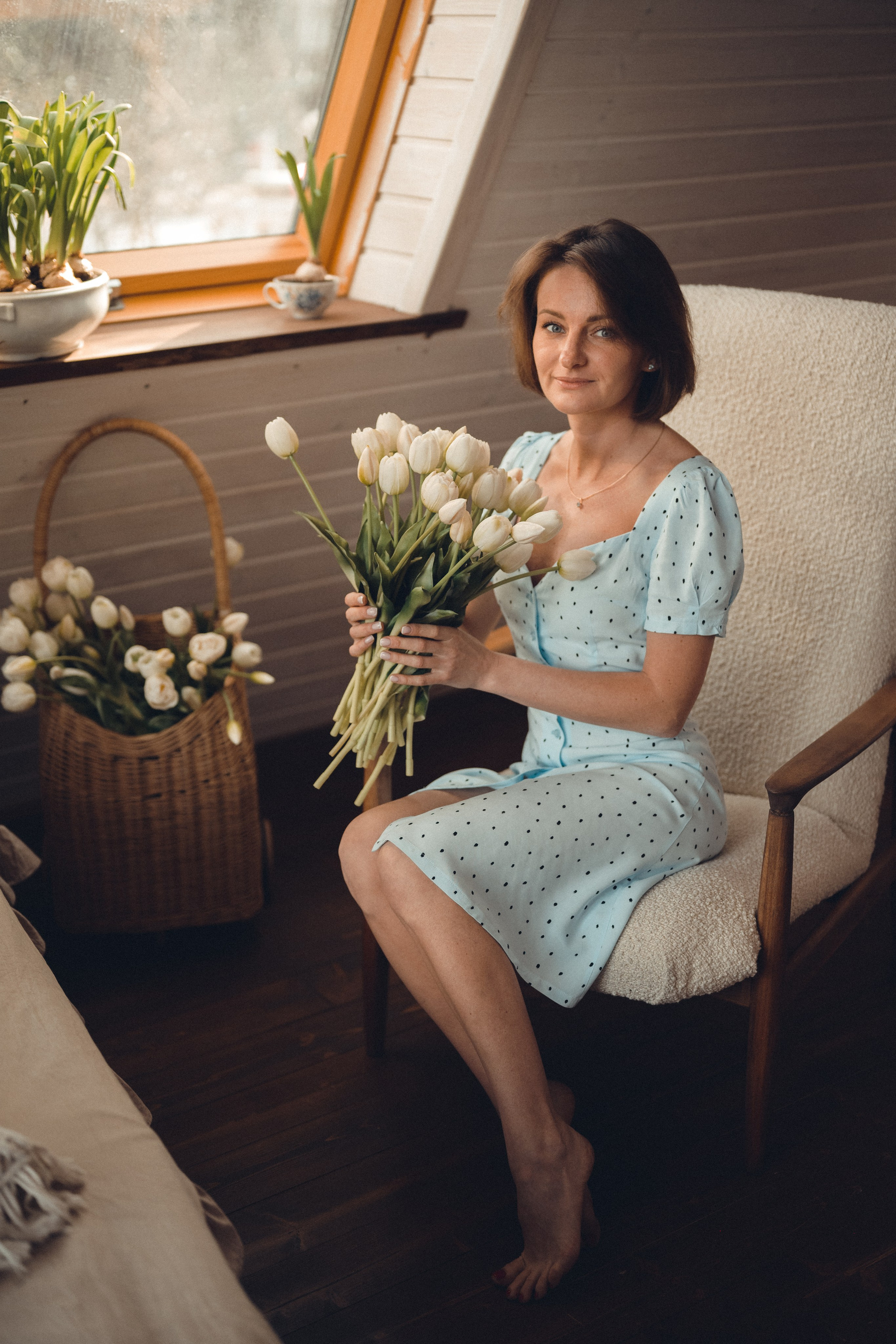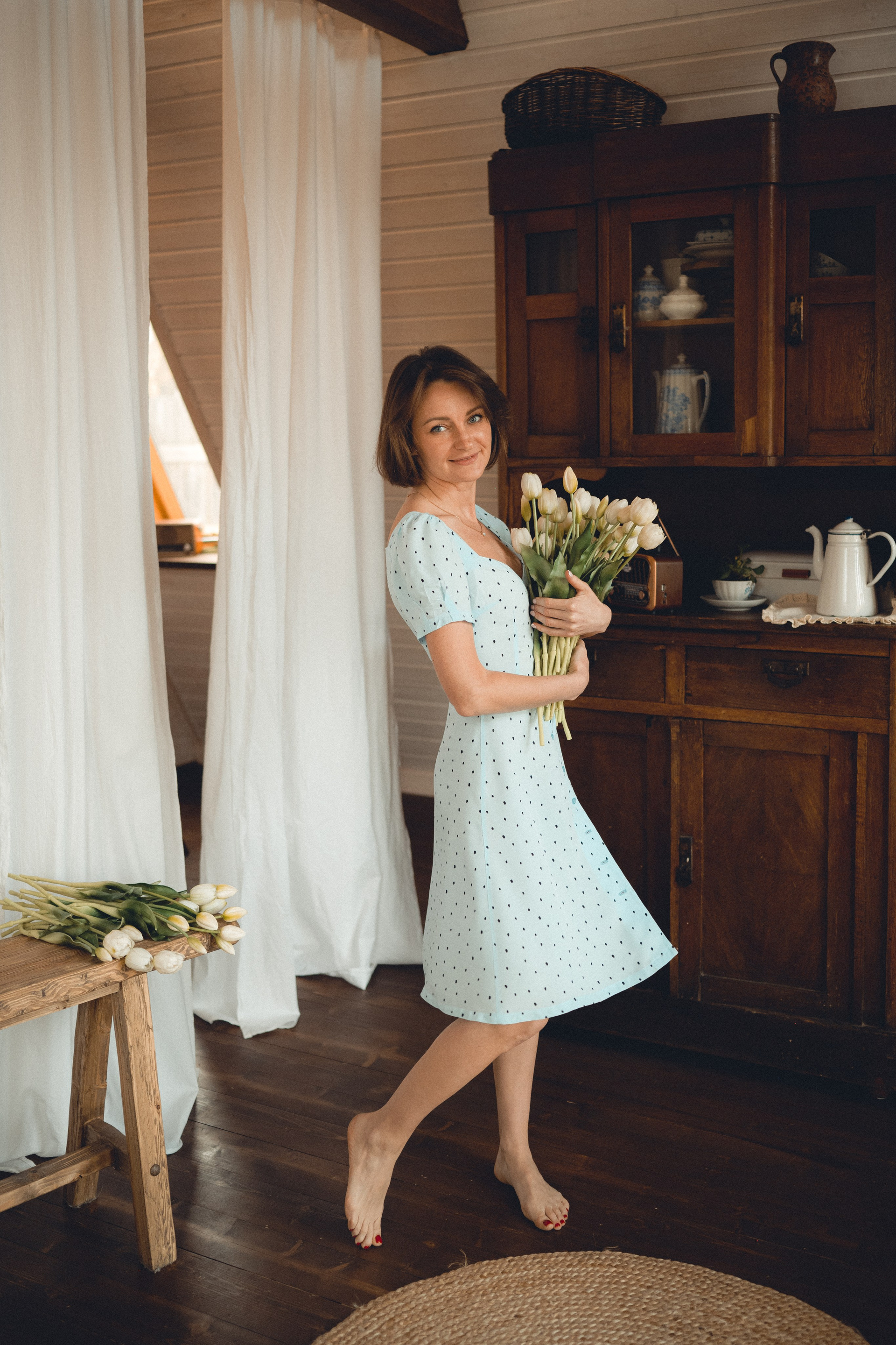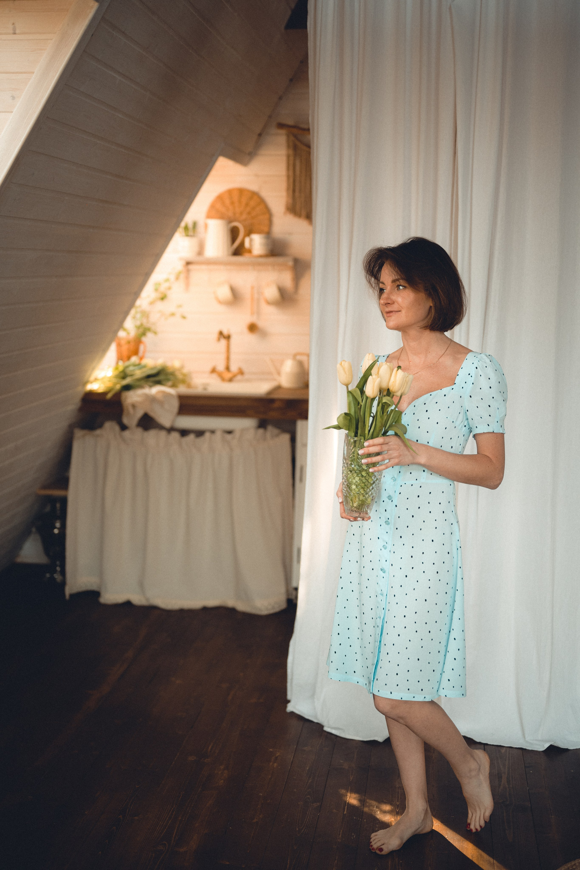 Мне кажется, это так здорово — рассказывать историю с помощью съемки. Эти фото потом интересно пересматривать, и как будто читать про тот самый день. Мы снимали два часа, выбрав два разных образа. А позировали мы через действия, это очень хороший способ не замечать камеру и проживать позы, а не просто их конструировать. Домик абсолютно милый и потрясающий, находится в городе Пушкино Московской области.