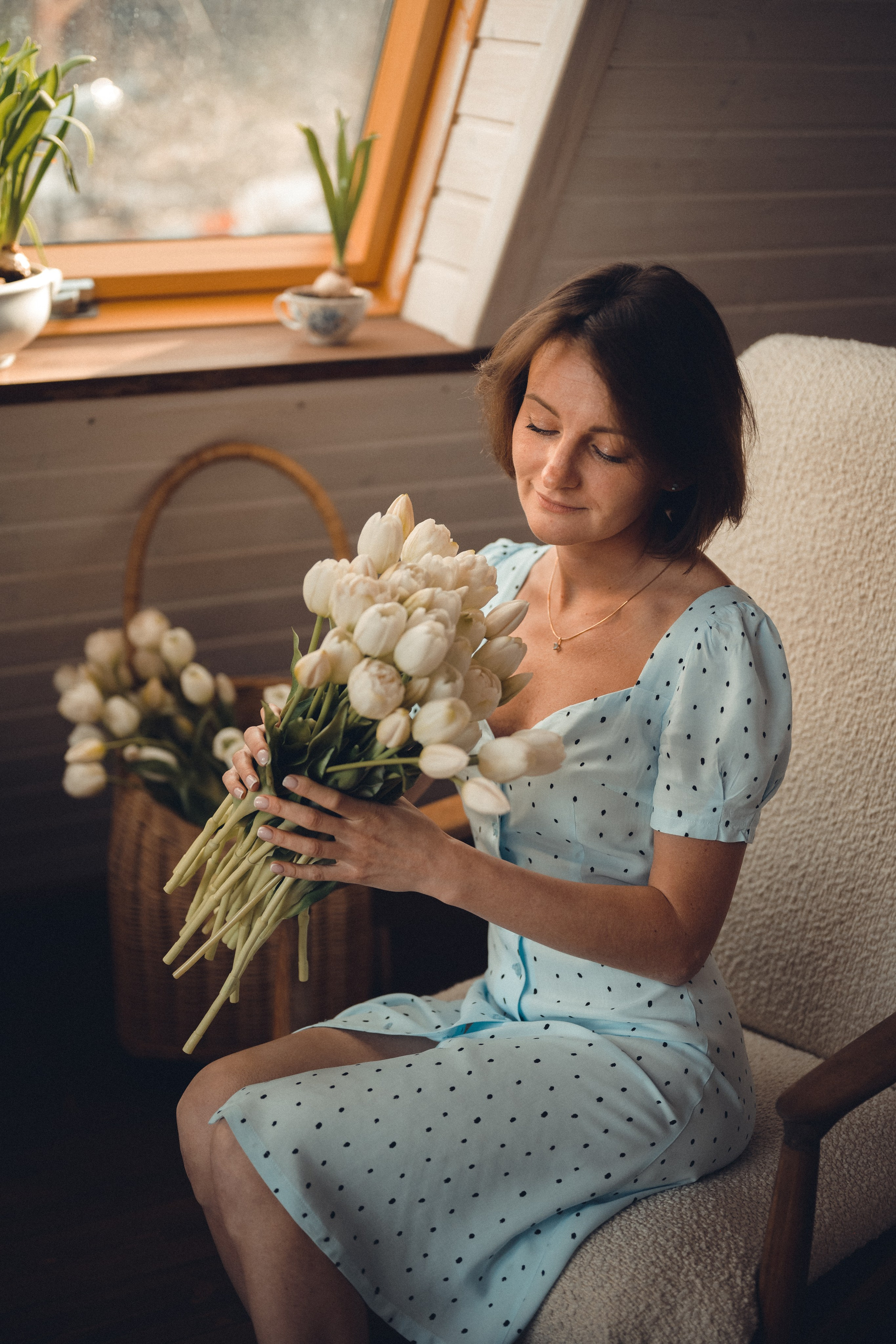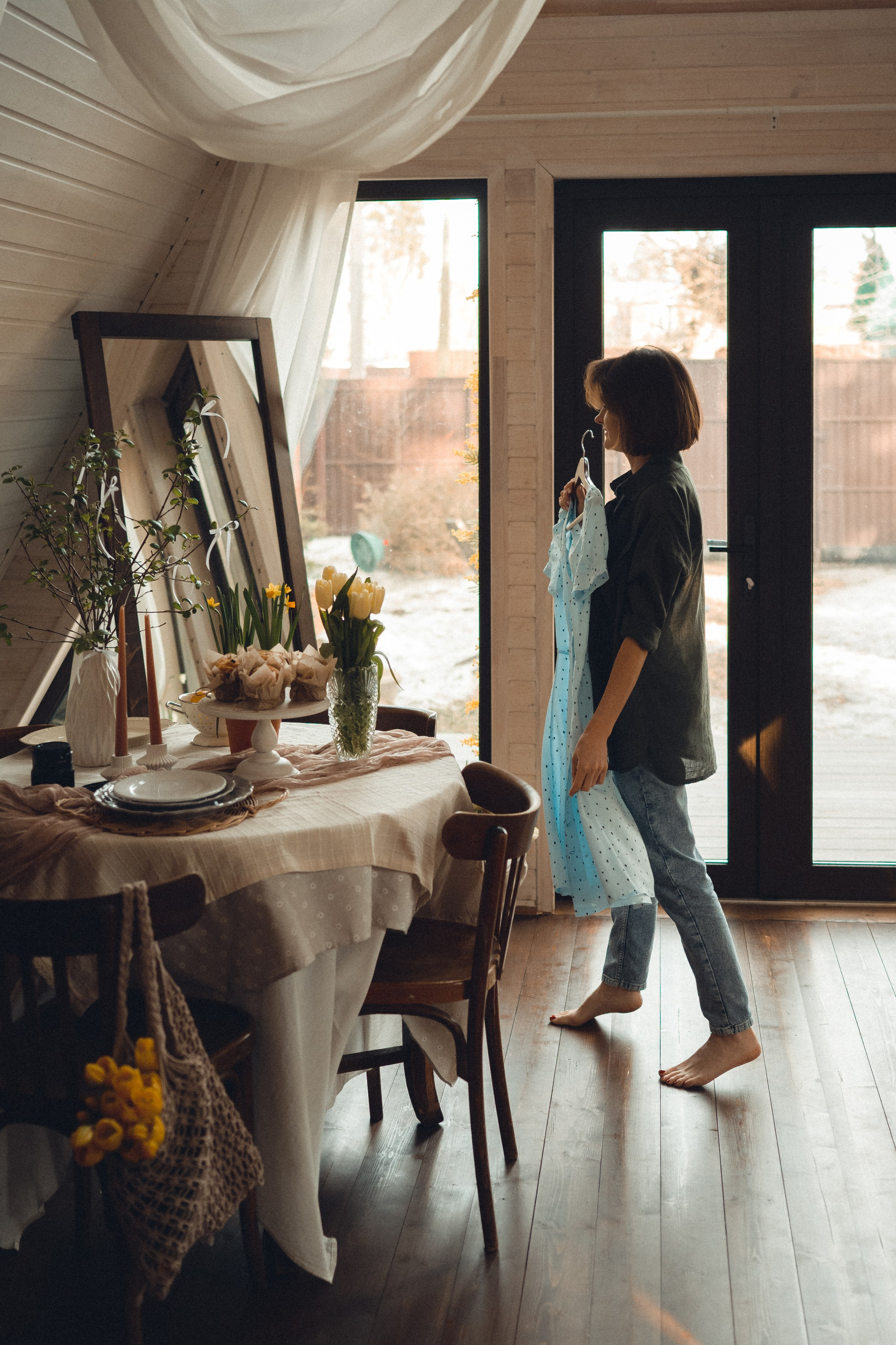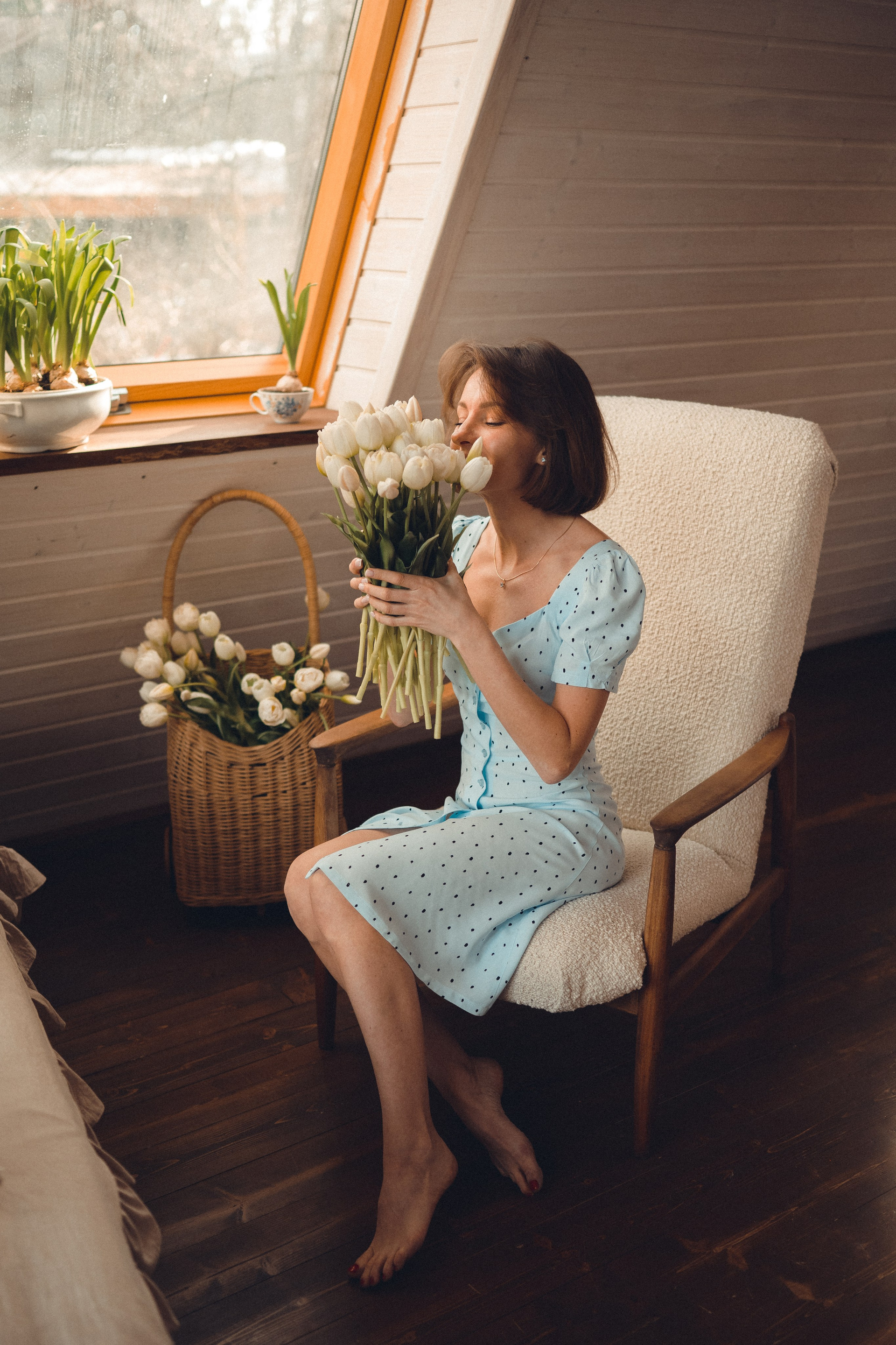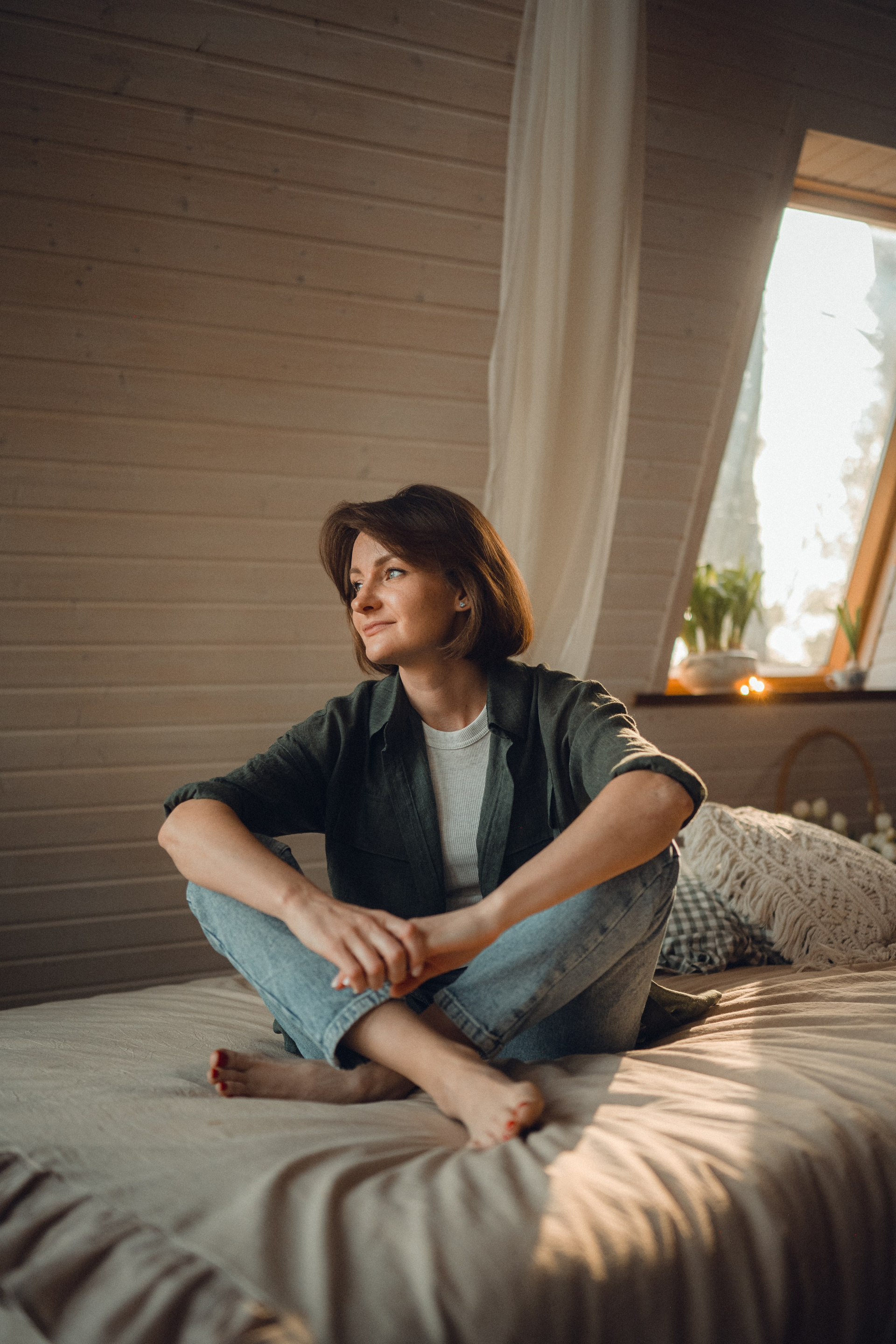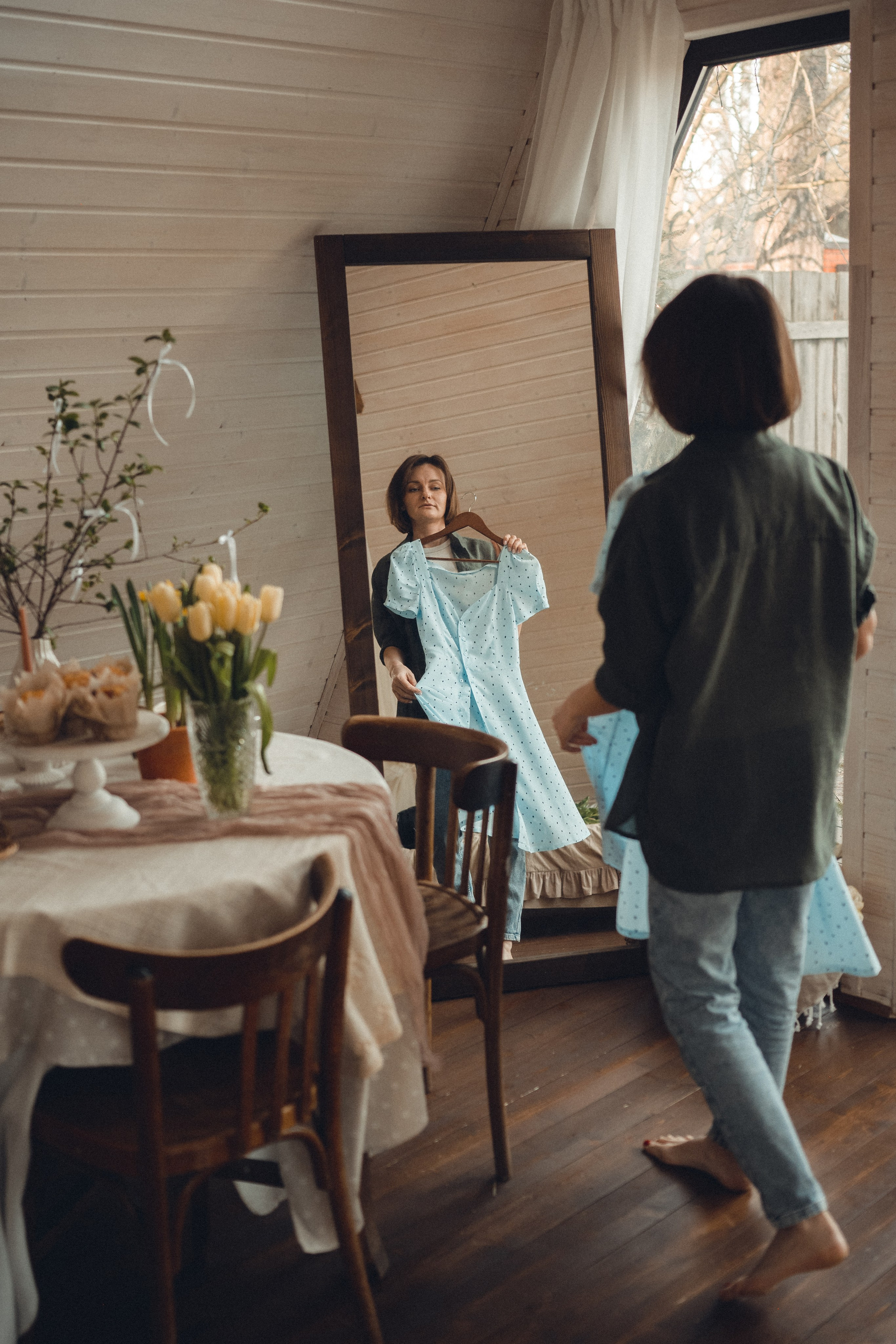 Мне кажется, это так здорово — рассказывать историю с помощью съемки. Эти фото потом интересно пересматривать, и как будто читать про тот самый день. Мы снимали два часа, выбрав два разных образа. А позировали мы через действия, это очень хороший способ не замечать камеру и проживать позы, а не просто их конструировать. Домик абсолютно милый и потрясающий, находится в городе Пушкино Московской области.