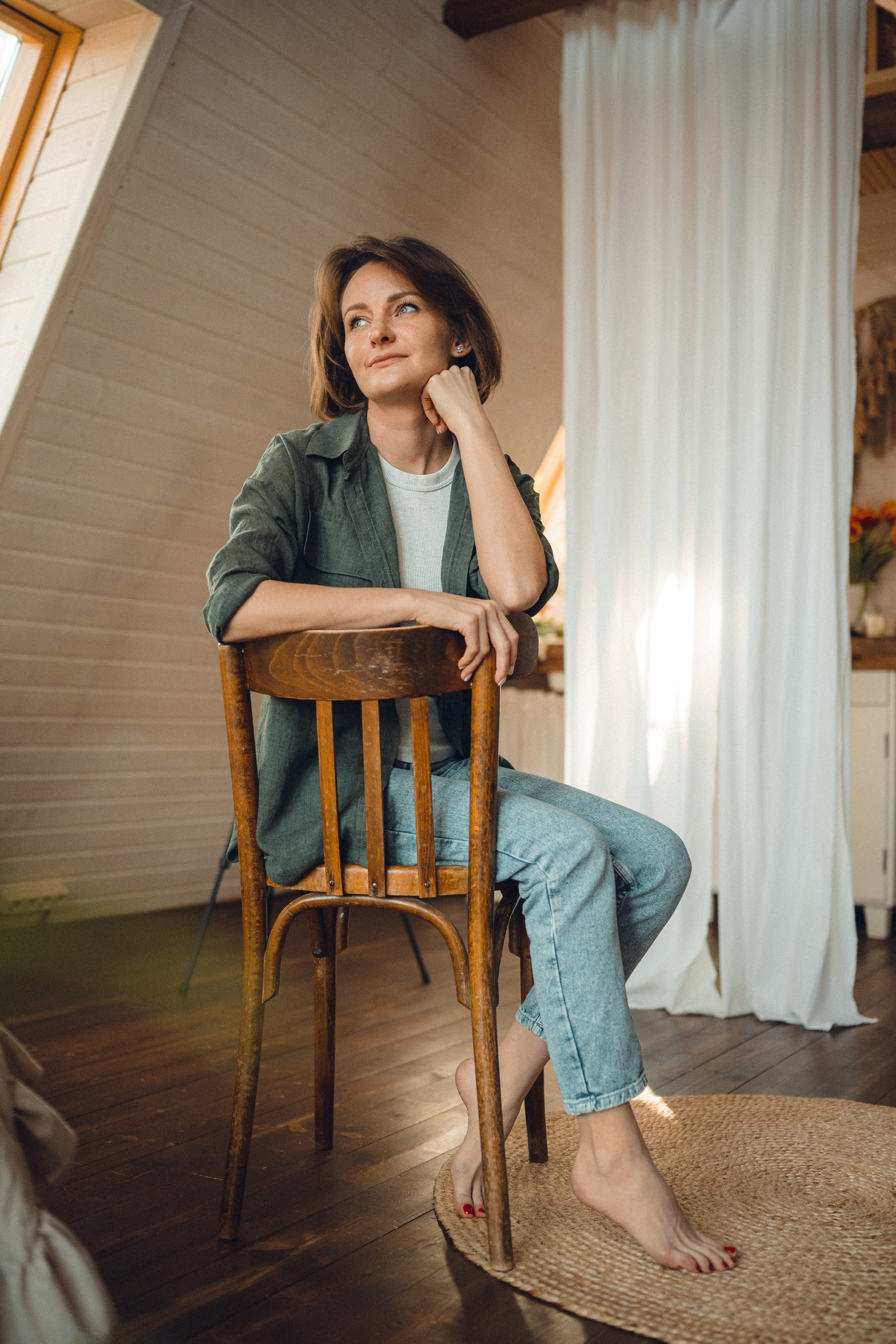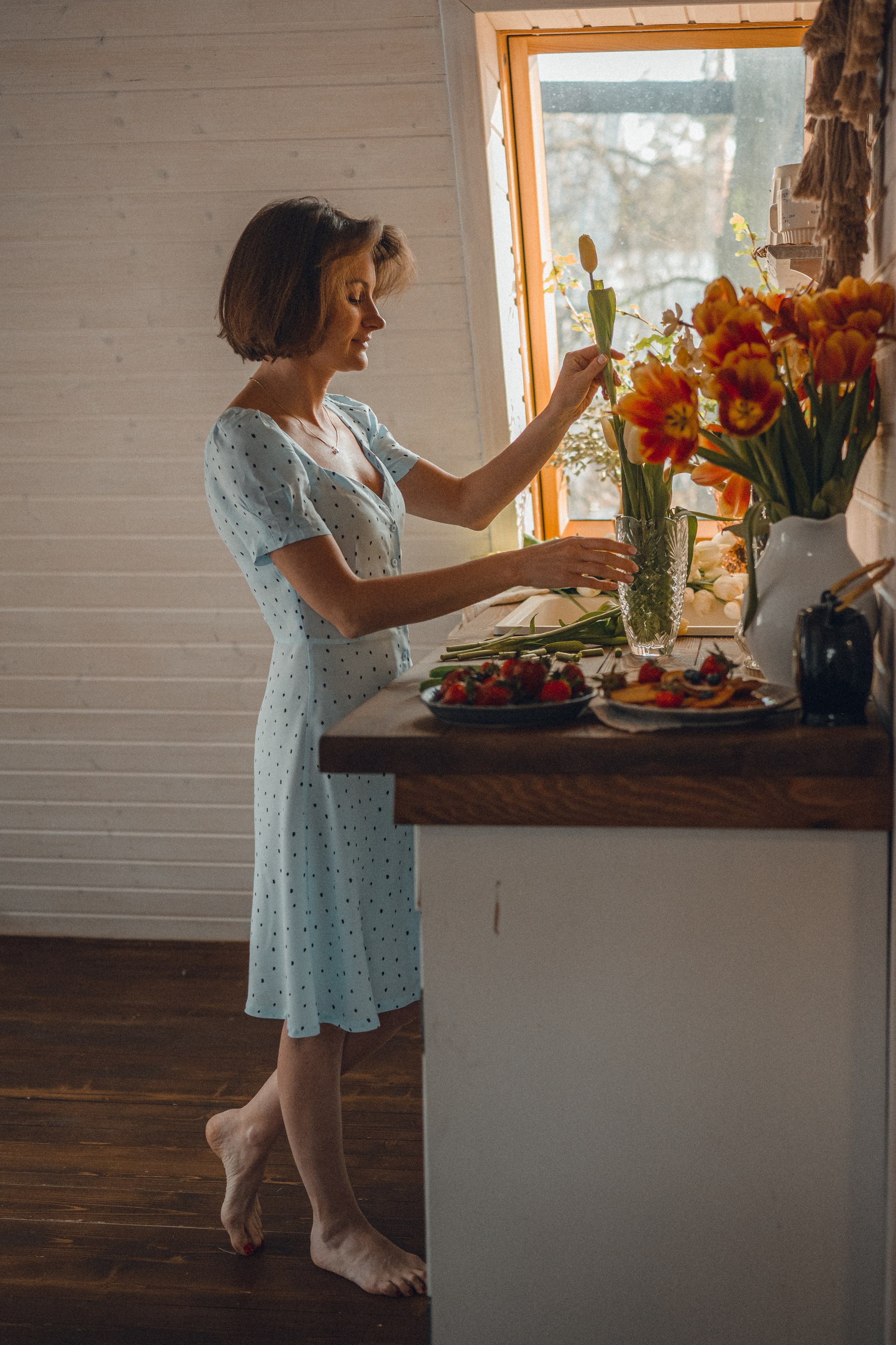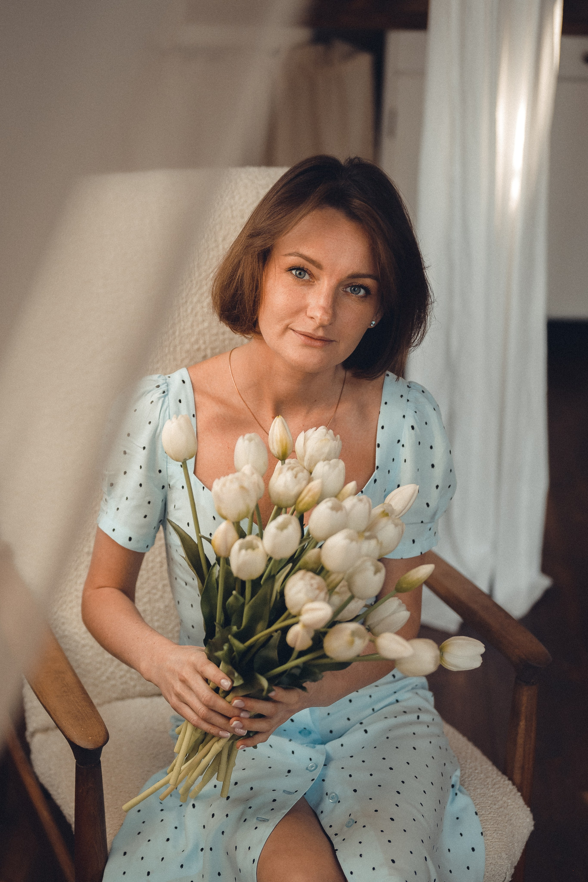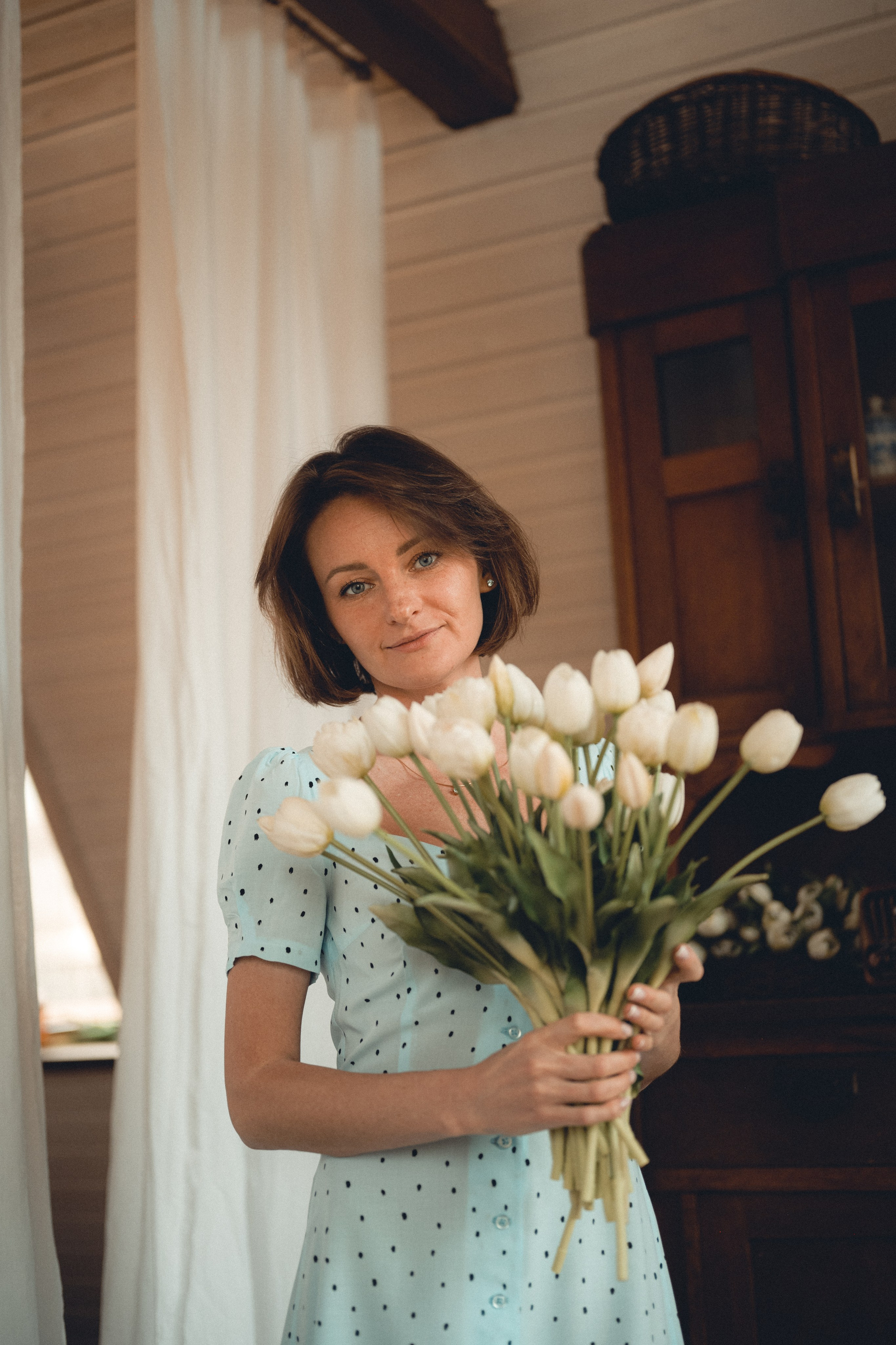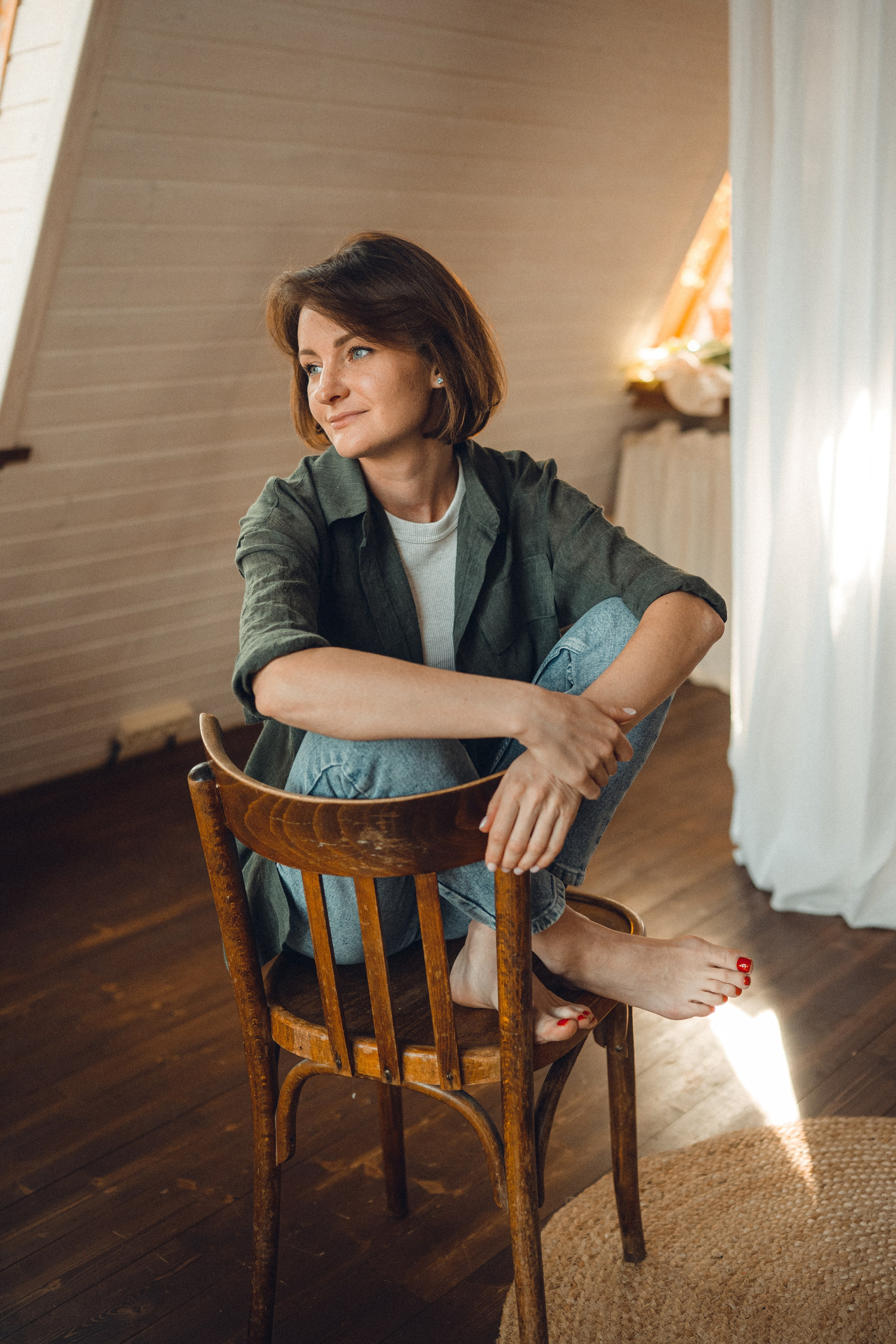 Мне кажется, это так здорово — рассказывать историю с помощью съемки. Эти фото потом интересно пересматривать, и как будто читать про тот самый день. Мы снимали два часа, выбрав два разных образа. А позировали мы через действия, это очень хороший способ не замечать камеру и проживать позы, а не просто их конструировать. Домик абсолютно милый и потрясающий, находится в городе Пушкино Московской области.