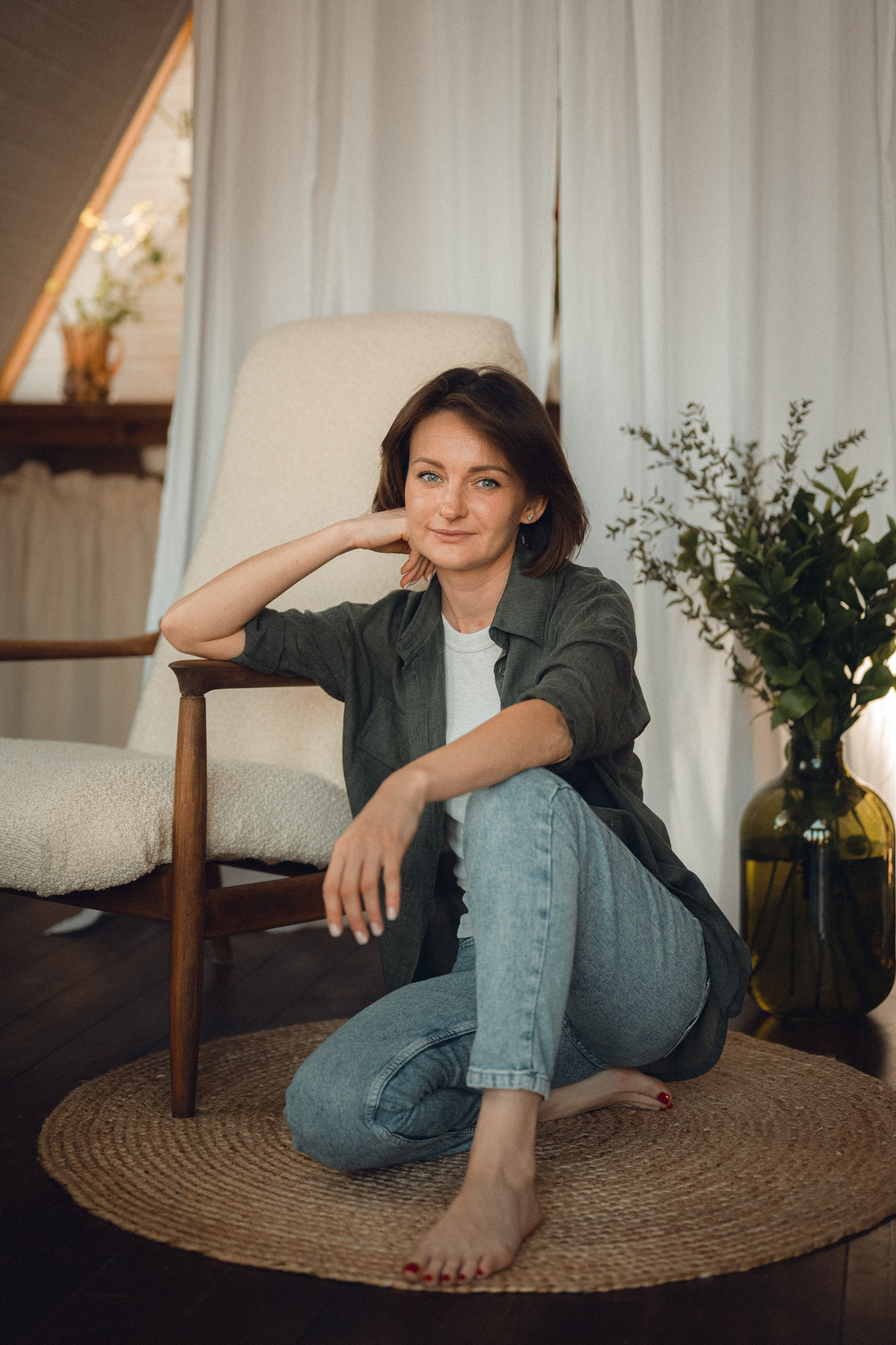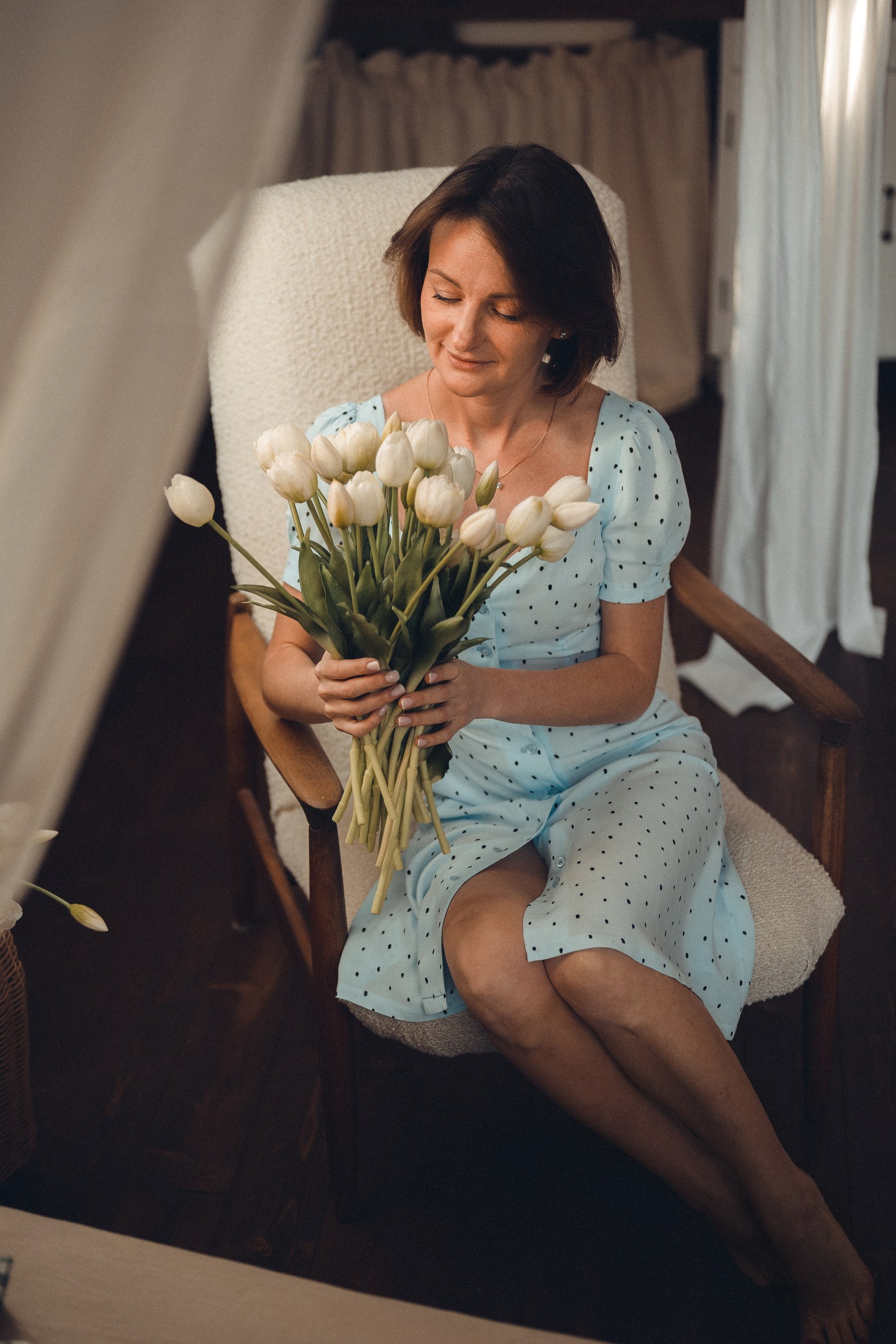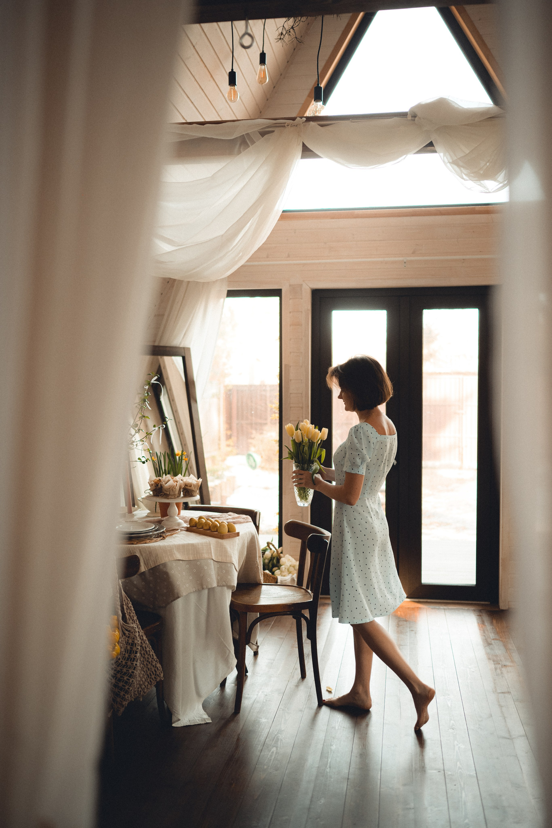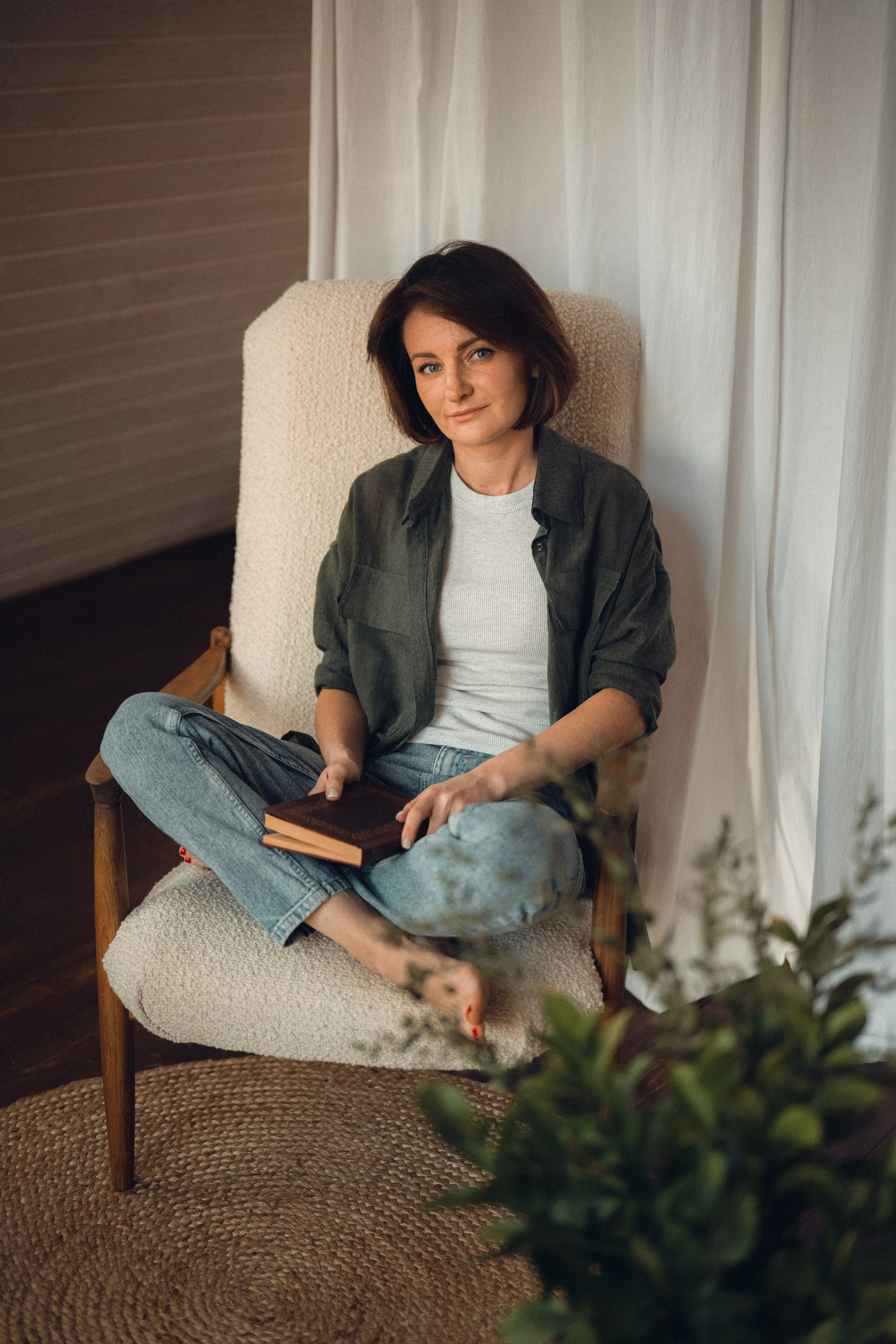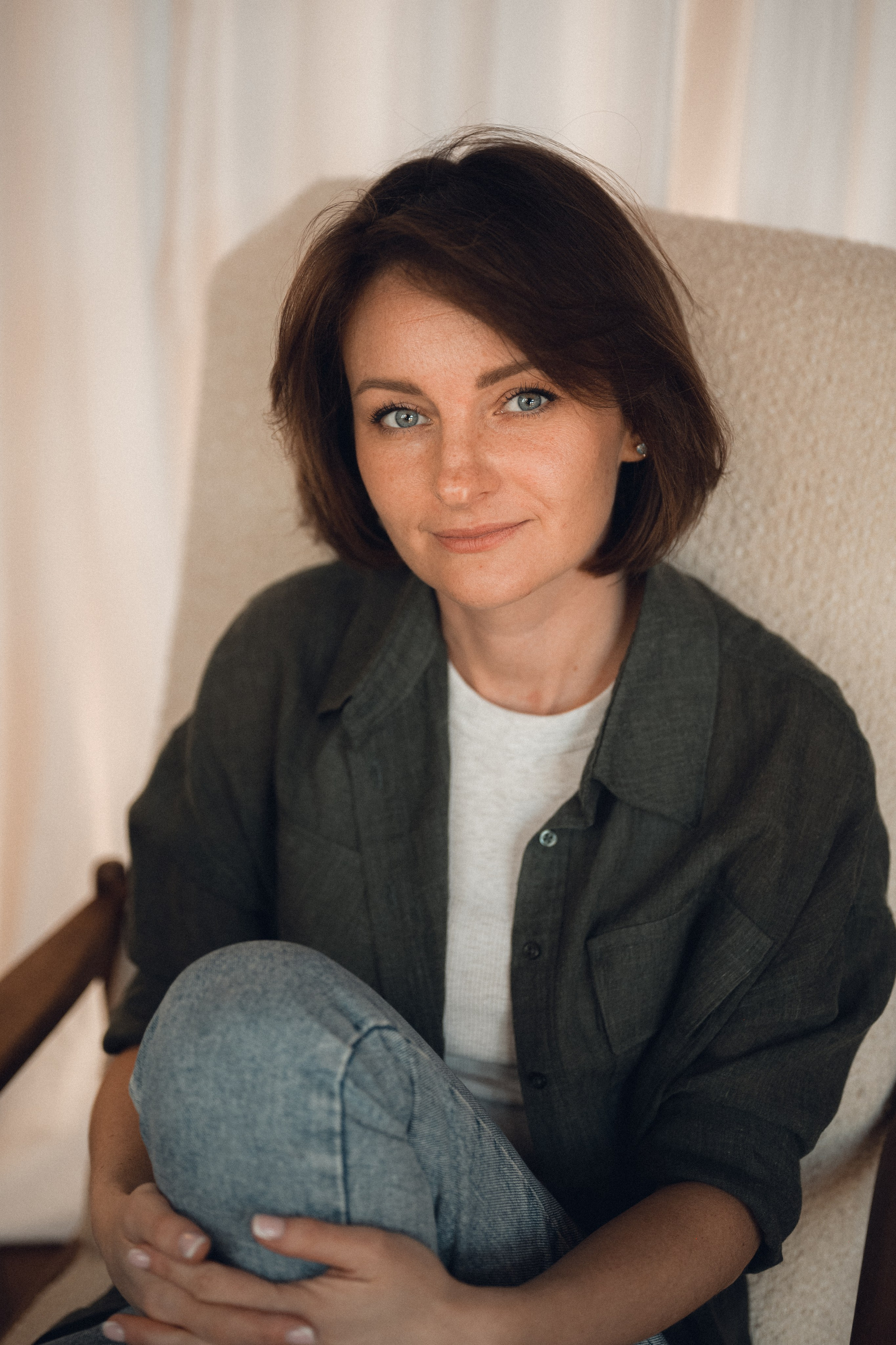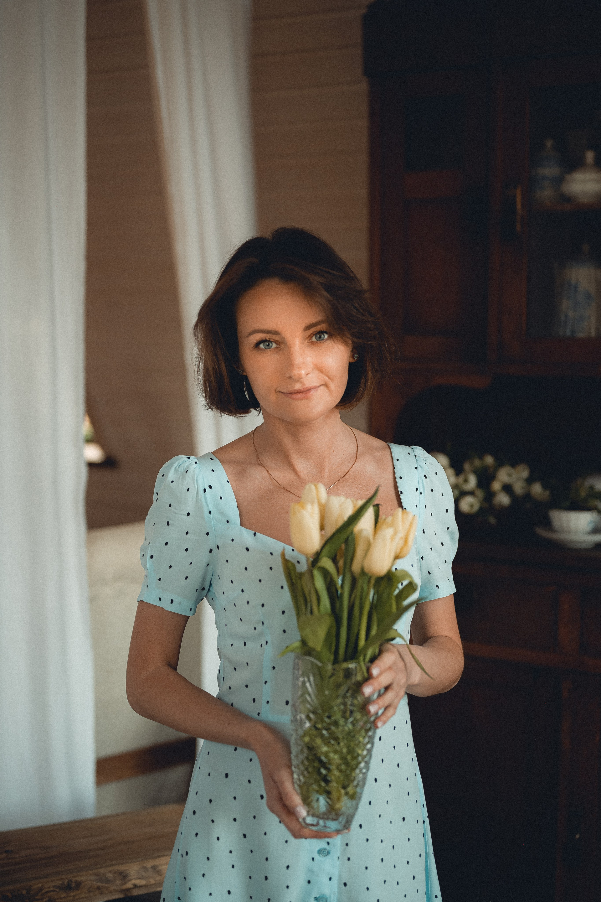 Мне кажется, это так здорово — рассказывать историю с помощью съемки. Эти фото потом интересно пересматривать, и как будто читать про тот самый день. Мы снимали два часа, выбрав два разных образа. А позировали мы через действия, это очень хороший способ не замечать камеру и проживать позы, а не просто их конструировать. Домик абсолютно милый и потрясающий, находится в городе Пушкино Московской области.