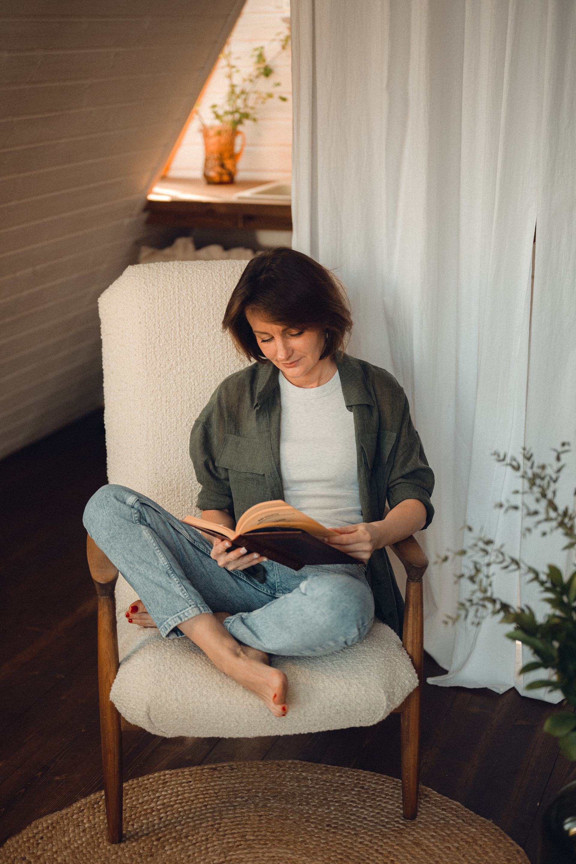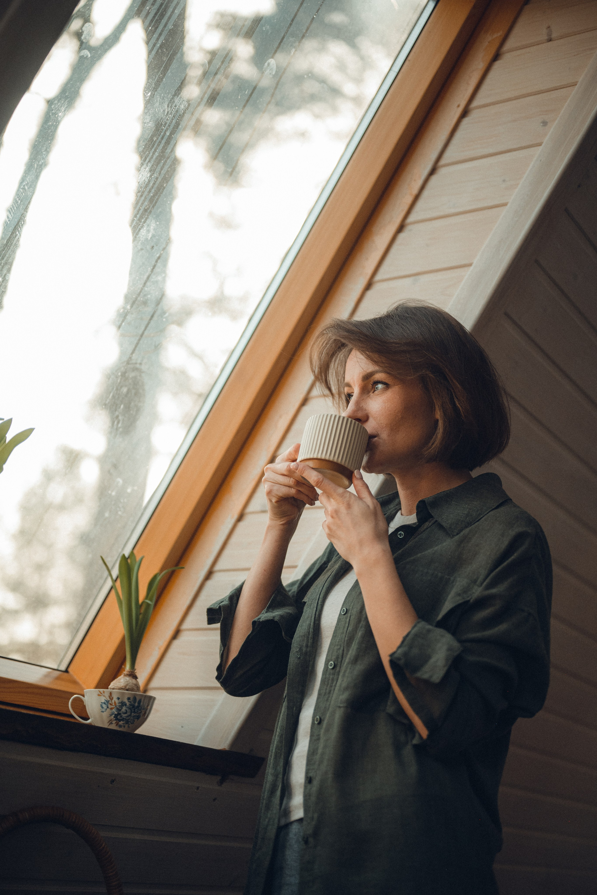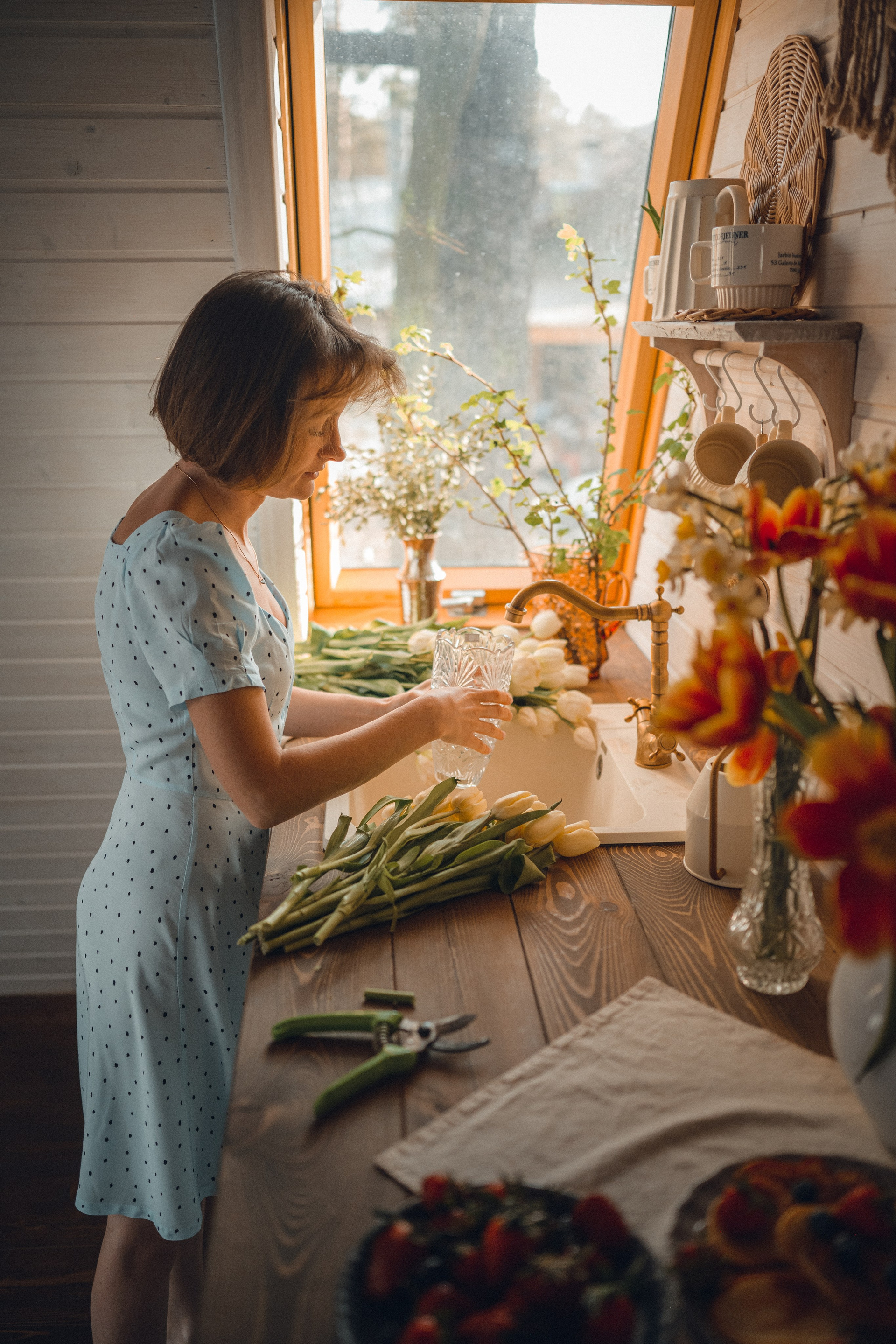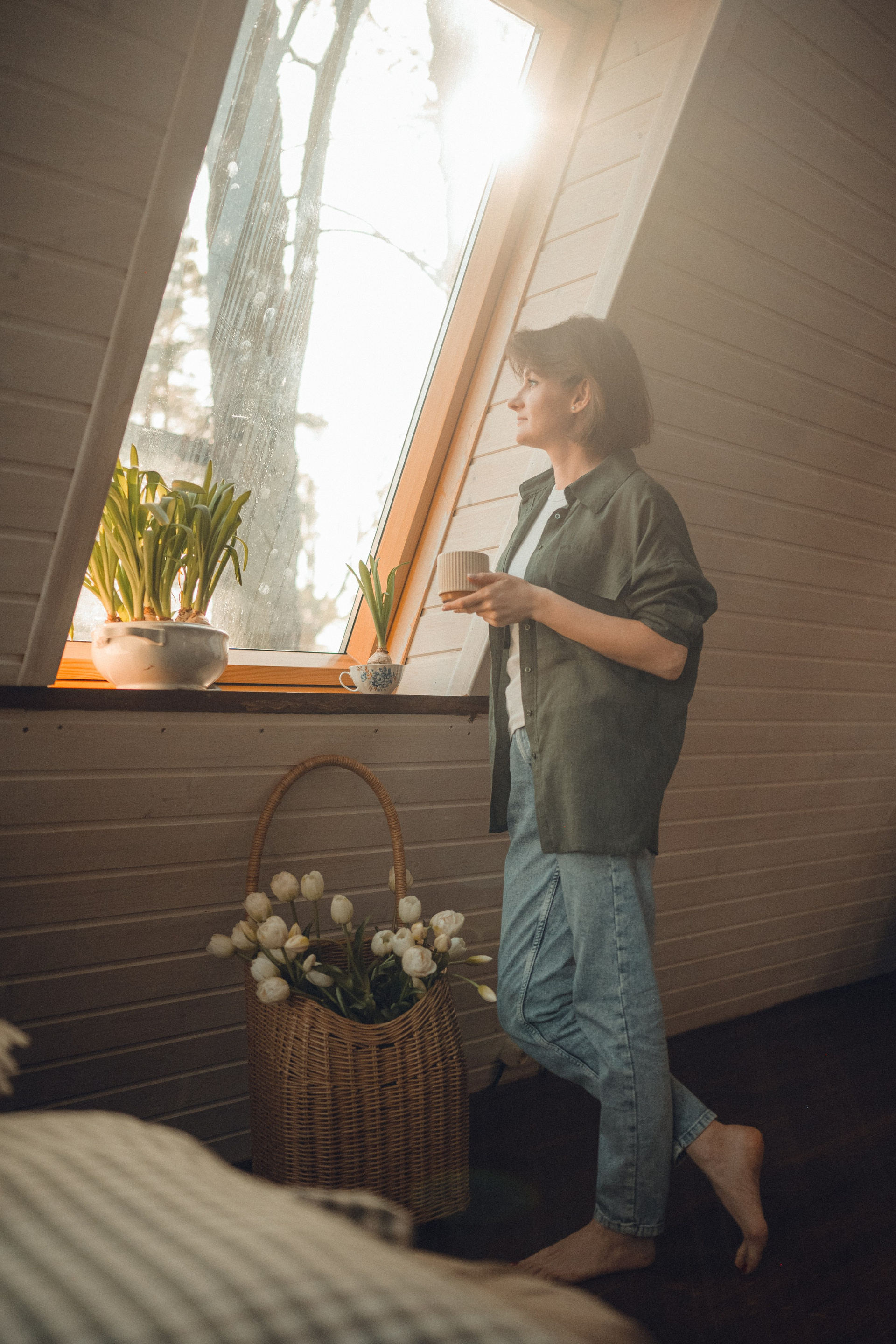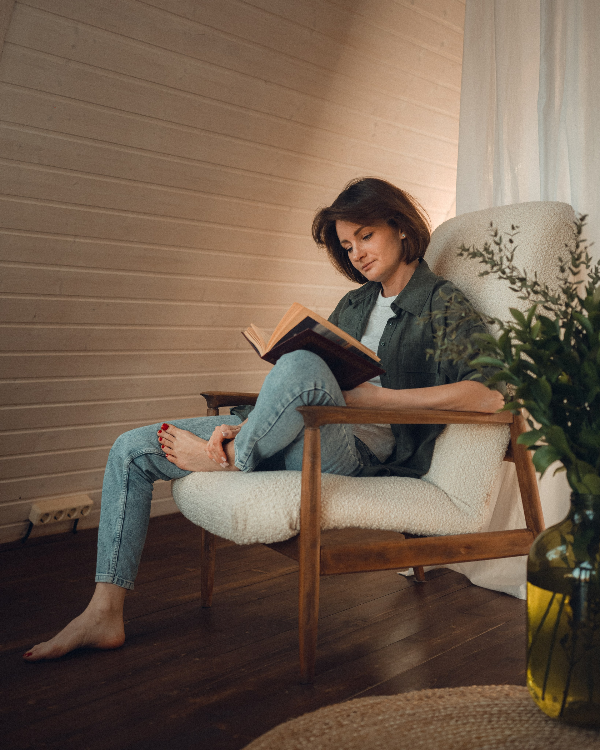 Мне кажется, это так здорово — рассказывать историю с помощью съемки. Эти фото потом интересно пересматривать, и как будто читать про тот самый день. Мы снимали два часа, выбрав два разных образа. А позировали мы через действия, это очень хороший способ не замечать камеру и проживать позы, а не просто их конструировать. Домик абсолютно милый и потрясающий, находится в городе Пушкино Московской области.