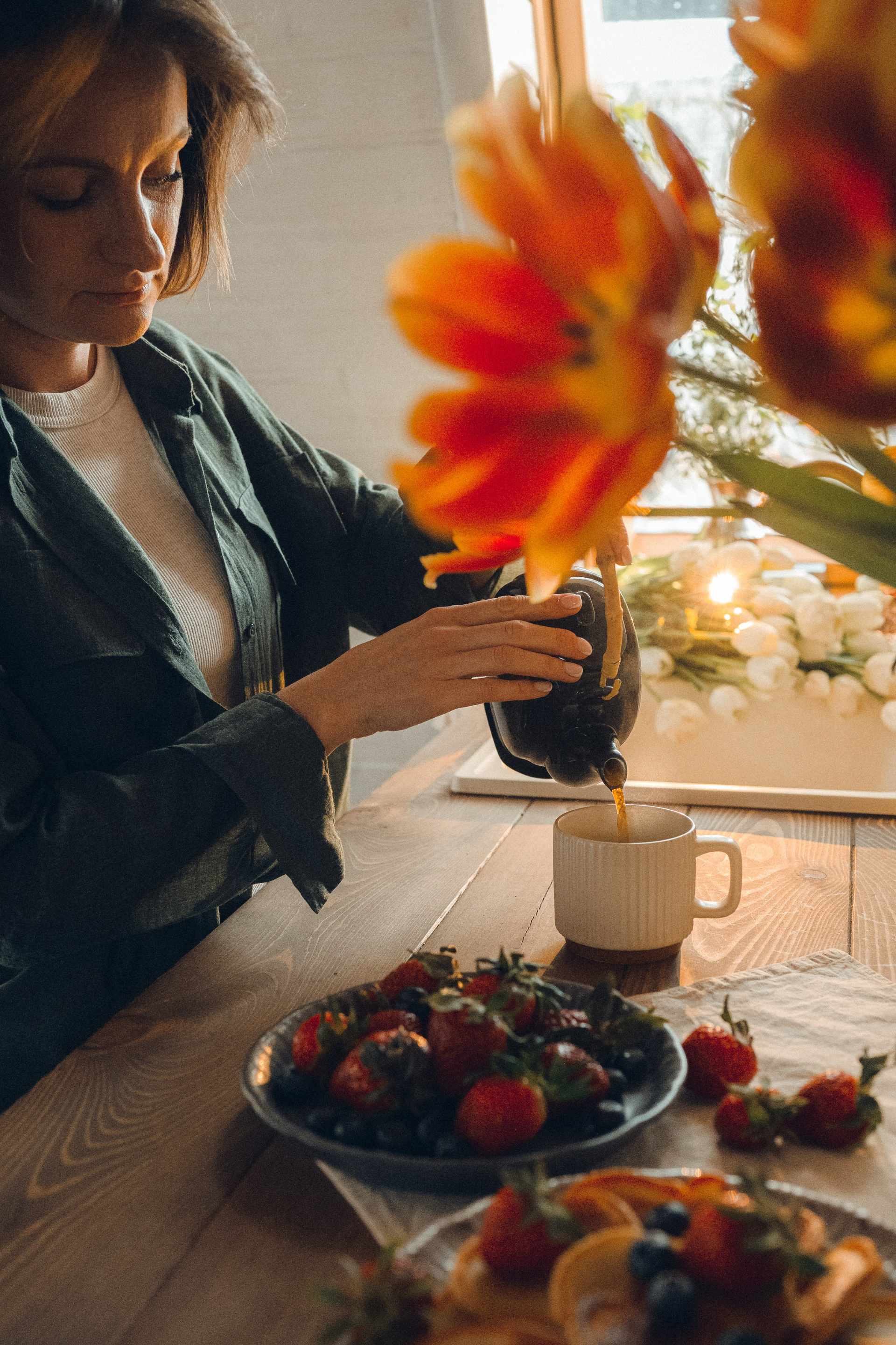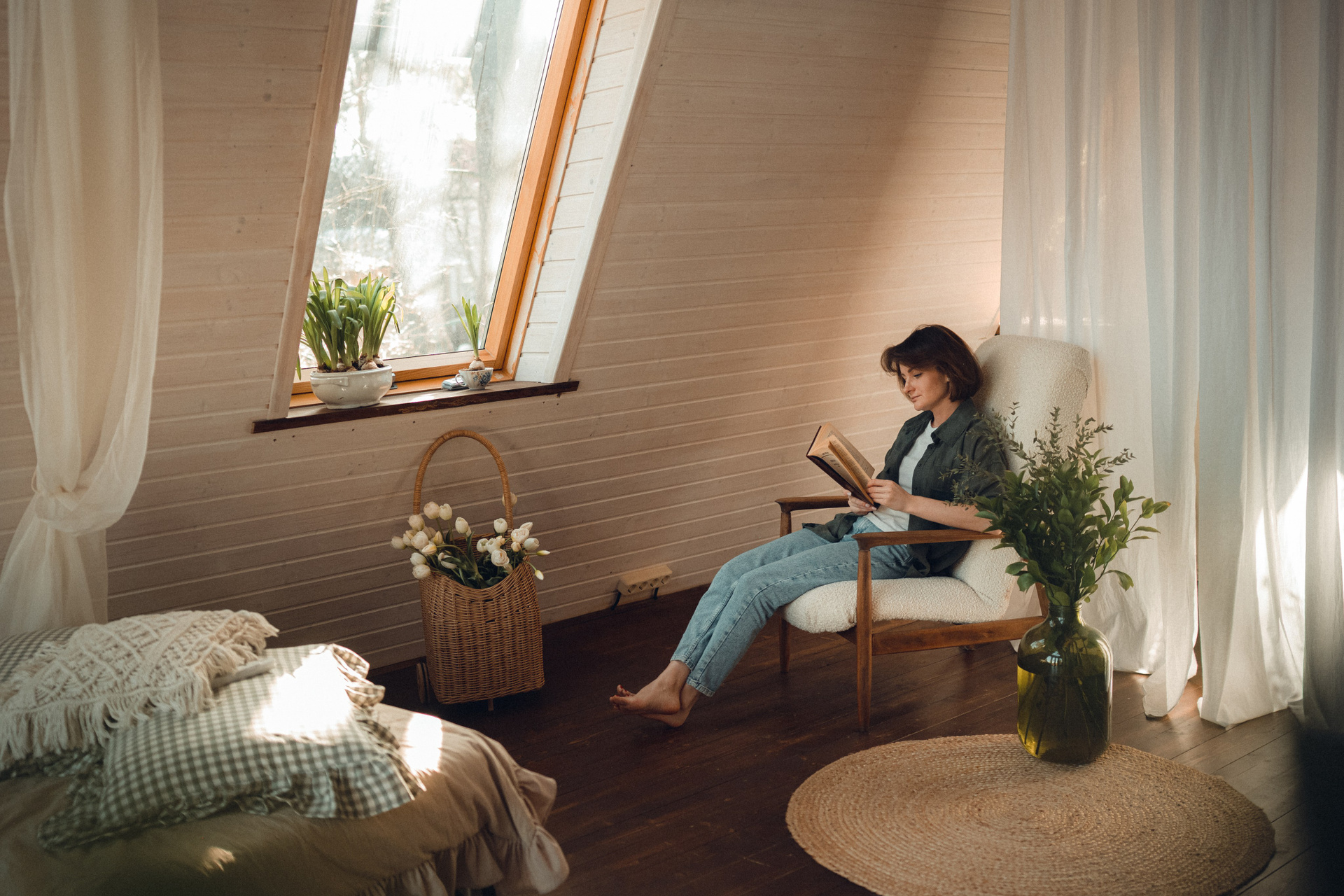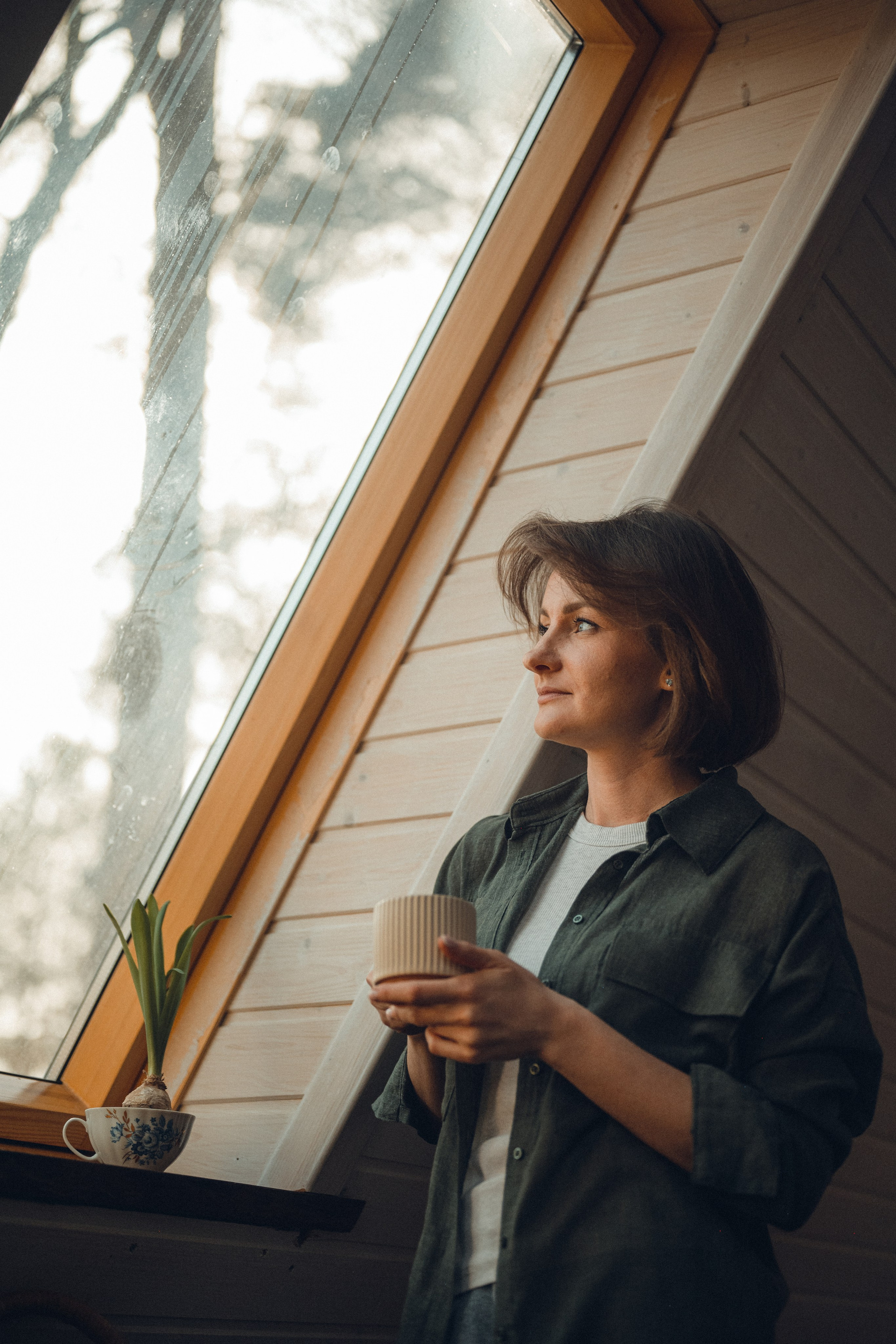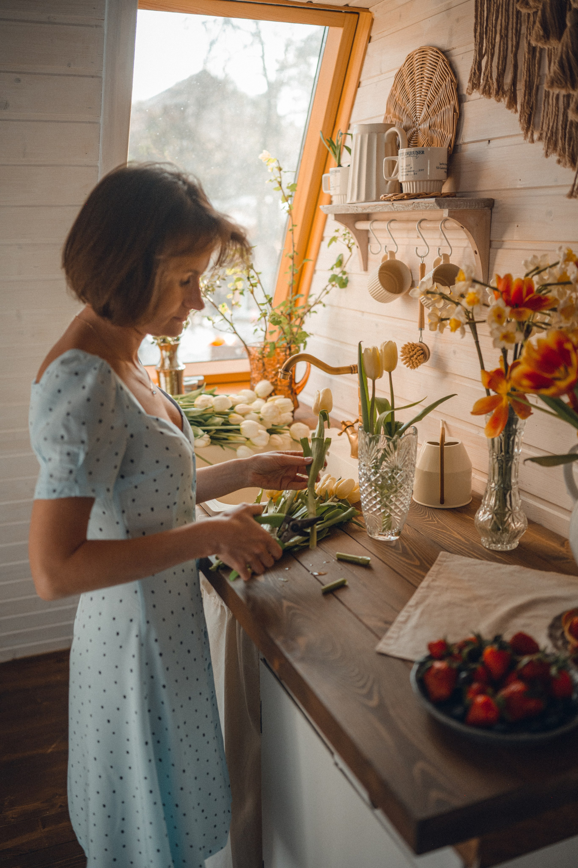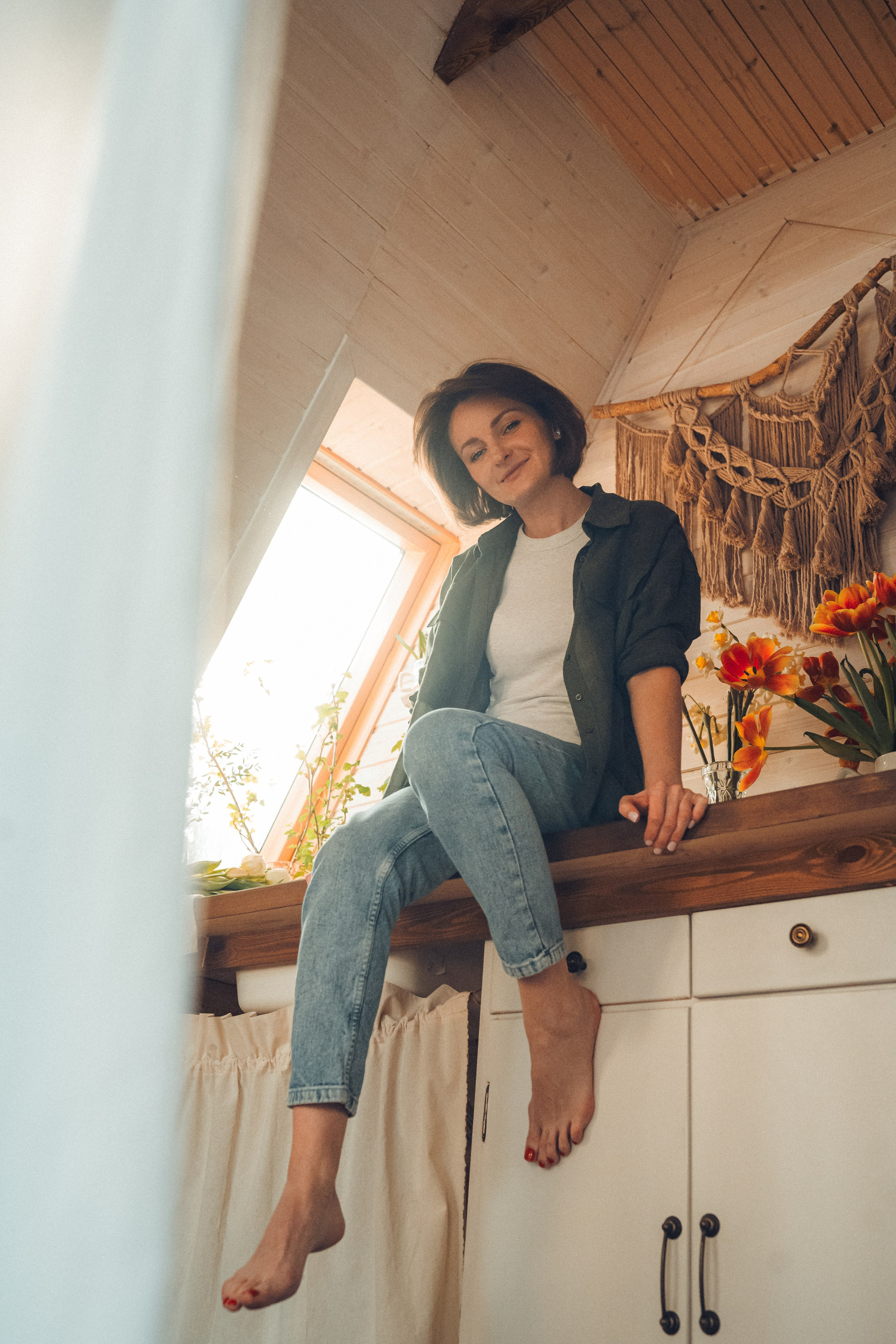 Мне кажется, это так здорово — рассказывать историю с помощью съемки. Эти фото потом интересно пересматривать, и как будто читать про тот самый день. Мы снимали два часа, выбрав два разных образа. А позировали мы через действия, это очень хороший способ не замечать камеру и проживать позы, а не просто их конструировать. Домик абсолютно милый и потрясающий, находится в городе Пушкино Московской области.