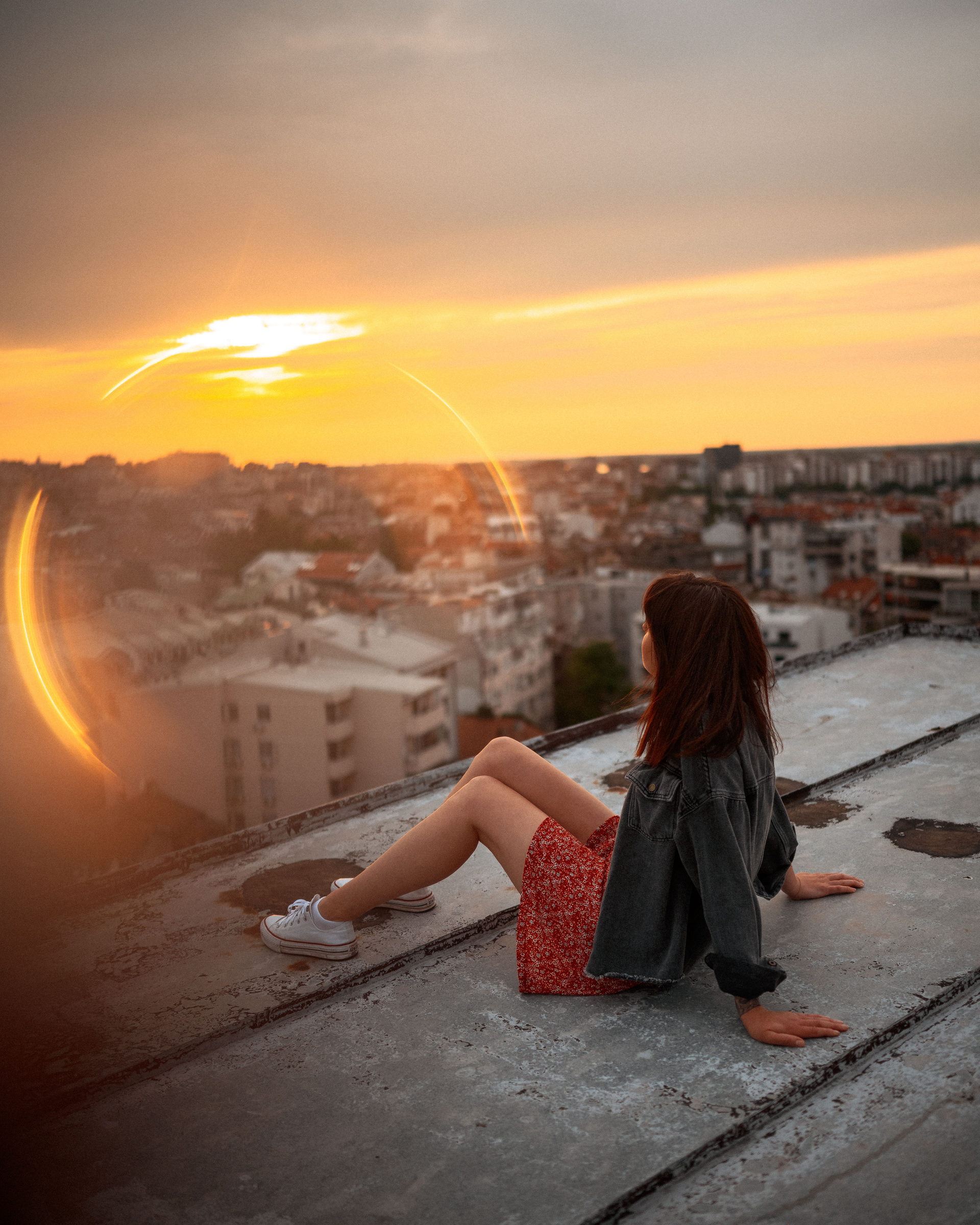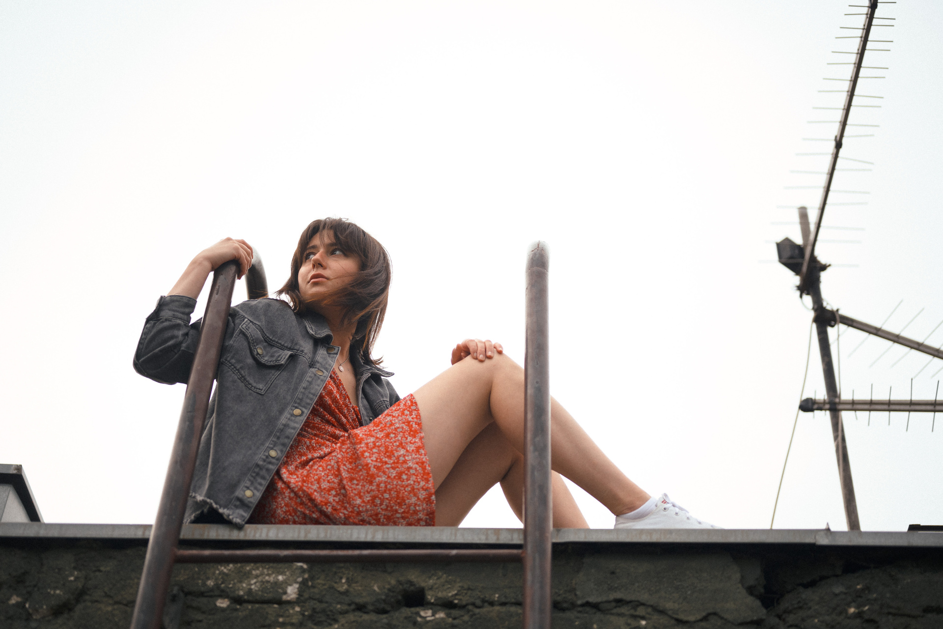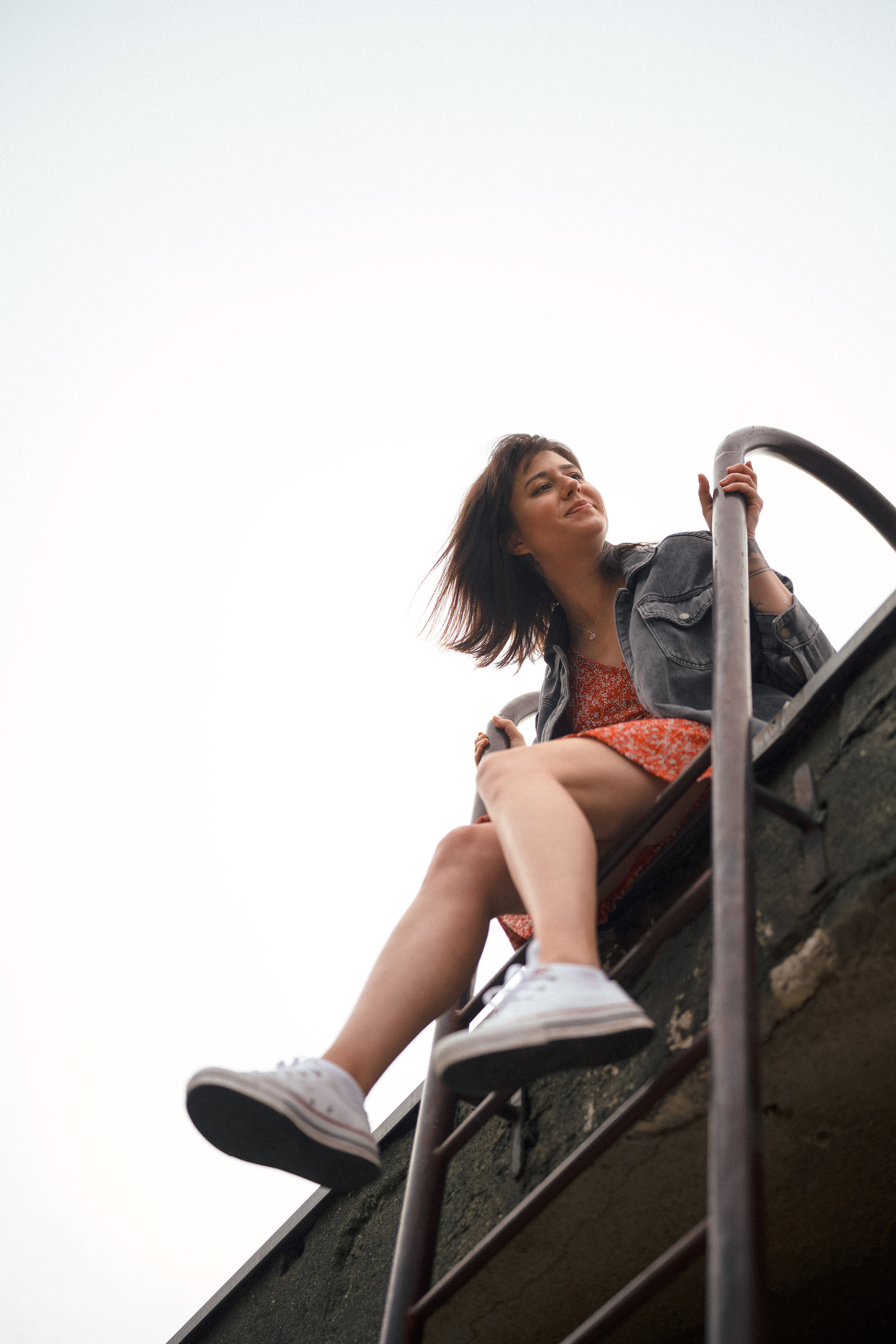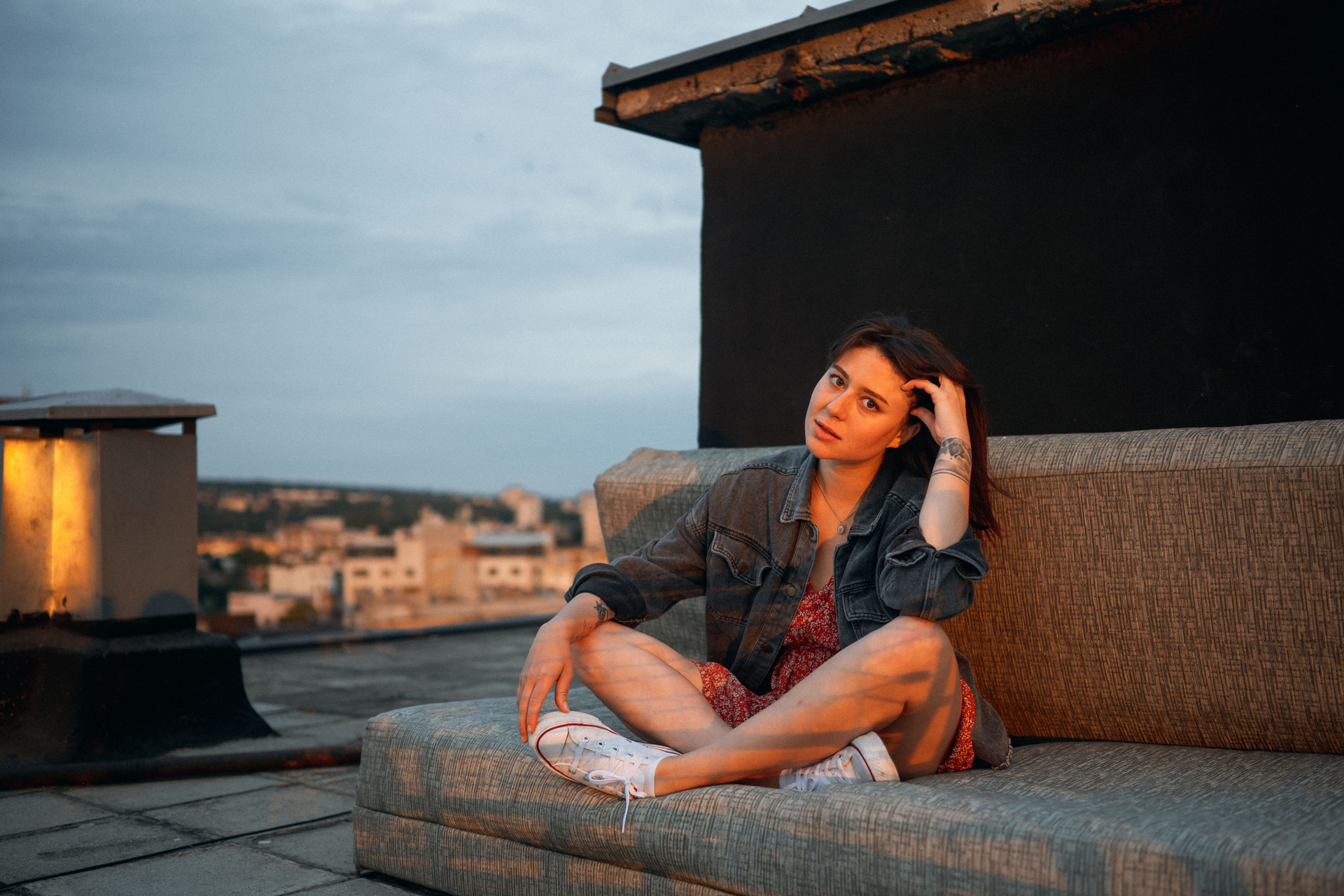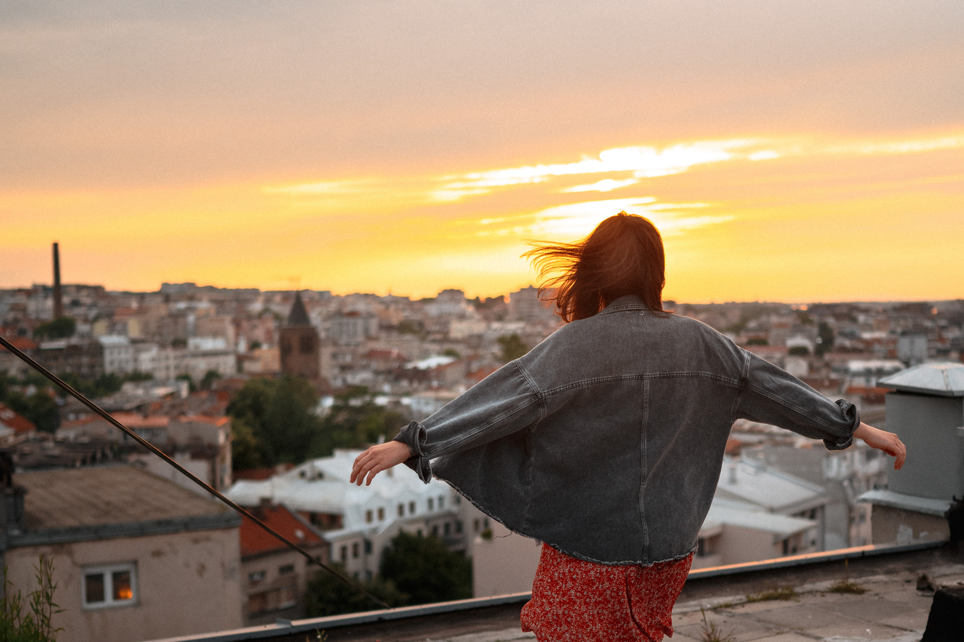 В тот день было облачно, но когда небо увидело, какую красоту мы собираемся сотворить, то сжалилось и изменило свои планы. И мы наблюдали невероятный закат… Все было, как в фильме. Романтика крыши, теплый свет, Женино летнее платье, мне так и виделась какая-то короткометражка про свободу и город. Кстати, это была первая съемка для Жени! Это +10050 к ответственности. Сколько раз я слышала от ребят о плохом опыте, о неловкости. Знаете, главное, это хорошо провести время, расслабиться любыми способами, даже если приходится представлять, что вместо камеры в руках у человека напротив — любимое вино.